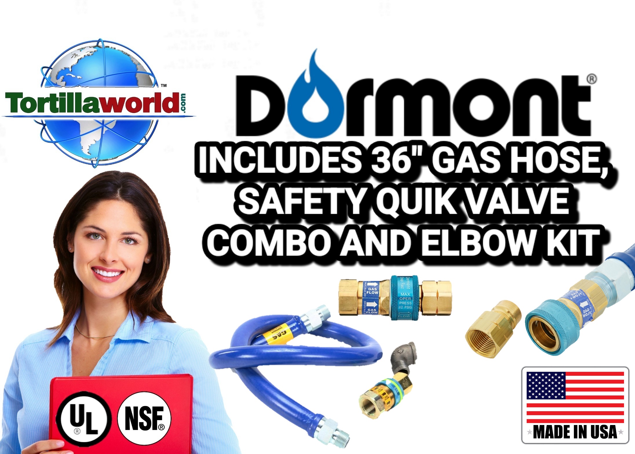 Commercial grade gas hose kit #16100BPCF36 contains, (1) 1-36″ long commercial grade movable gas hose connector composed of 301 stainless steel corrugated tube covered with a tight weave of stainless-steel braid specifically engineered for caster mounted commercial cooking & tortilla Industry equipment like traditional corn cooking tubs, tortilla chips, tostadas and churrito basket fryers from 30 per hour etc. The outside hose coating is an antimicrobial PVC coating that inhibits growth of bacteria, mold and mildew on the connector. Rotational technology fittings on both ends of the connector rotate 360 degrees, greatly reducing stress at both connector ends. (2) 1-1″ Safety quik disconnect valve is designed specifically for the food industry, meeting the safety and operational needs of commercial kitchens, doing the work of both a quick disconnect and a valve. The gas connector cannot be disconnected until the gas valve is shut off and cannot be opened until the gas connector is attached and employs a number of safety measurements while acting as a convenient quick disconnect fitting. The valve also has an internal thermal shutoff feature to protect against dangerous temperatures near the gas supply. (3) 1-1″ elbow