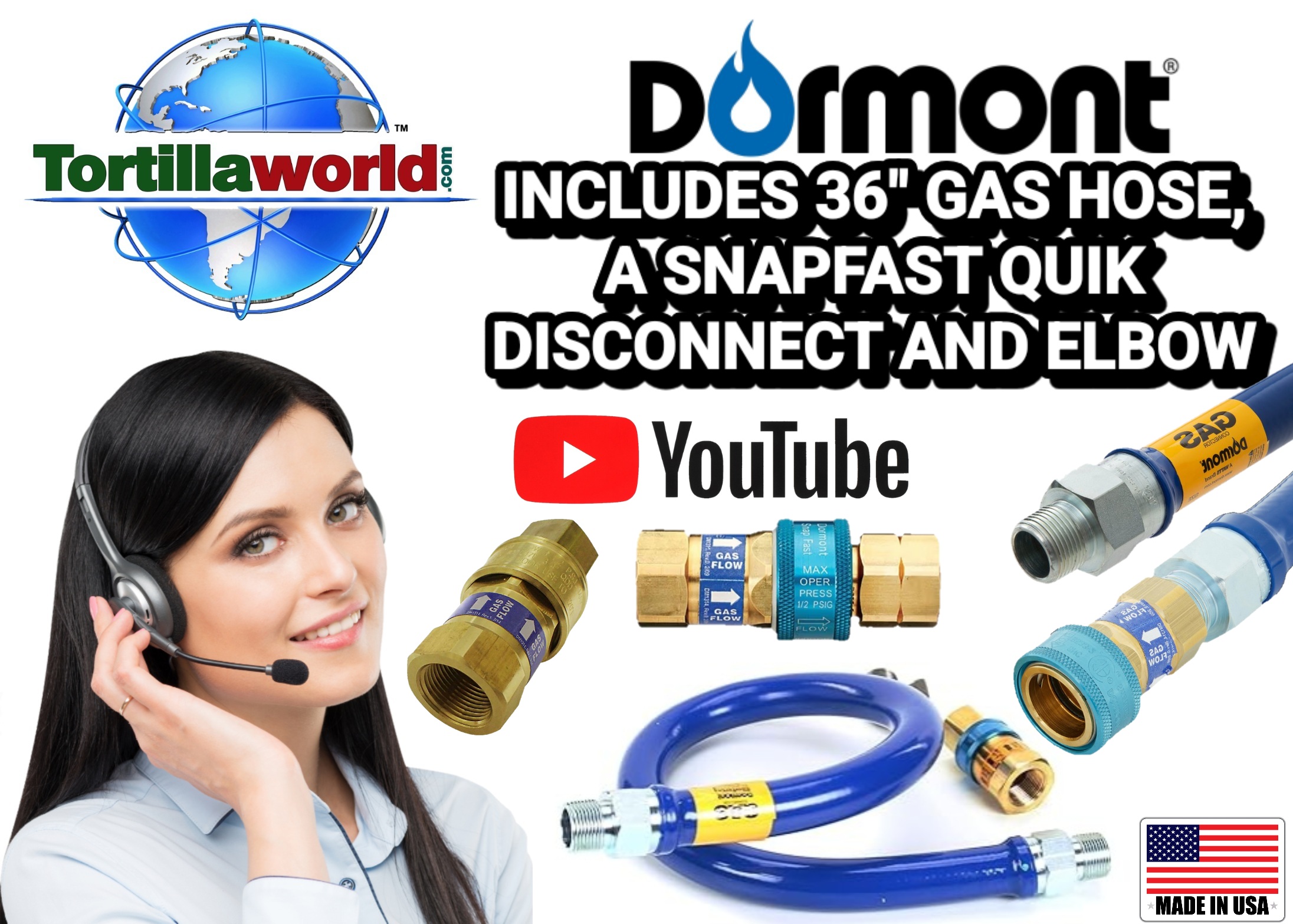 Commercial grade gas hose kit # contains (1) 1-36″ long commercial grade movable gas hose connector composed of 301 stainless steel corrugated tube covered with a tight weave of stainless-steel braid specifically engineered for caster mounted commercial cooking & tortilla Industry equipment like traditional corn cooking tubs, tortilla chips, tostadas and churrito basket style fryers etc. The outside hose coating is an antimicrobial PVC coating that inhibits growth of bacteria, mold and mildew on the connector. Rotational technology fittings on both ends of the connector rotate 360 degrees, greatly reducing stress at both connector ends. (2) 1-1″ Snapfast quik disconnect gas hose safety coupling is a durable push to connect & disconnect coupling that contains a thermal shutoff feature which is a polymer ring located inside the nipple that will melt and close the gas supply valve if the temperature rises above 350° F (177° C). The Snapfast quick disconnect couplings are designed to work only with the brand name of gas hose that we sell. It also features a push to connect feature which allows the coupling’s components to be joined quickly by simply pushing them together until they snap into place. The Snapfast disconnects the gas flow for safe, easy cleaning & maintenance and reconnects with just a push and a click. (3) 1-1″ elbow.