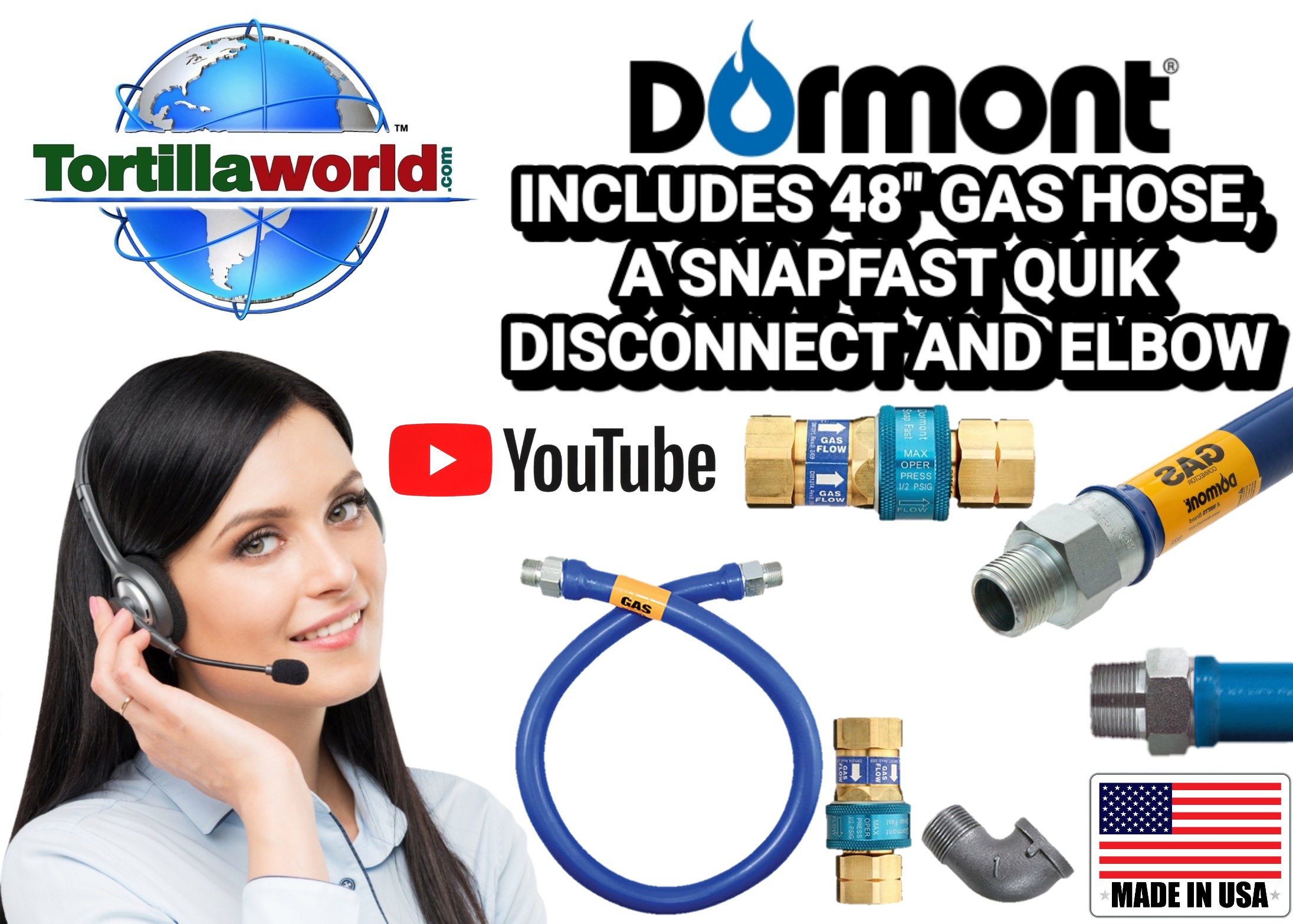 Commercial grade gas hose kit #16100BPQ48 contains, (1) 1-48″ long commercial grade movable gas hose connector composed of 301 stainless steel corrugated tube covered with a tight weave of stainless steel braid specifically engineered for caster mounted commercial cooking & tortilla Industry equipment like traditional corn cooking tubs, tortilla chips, tostadas and churrito basket fryers from 30 per hour etc. The outside hose coating is an antimicrobial PVC coating that inhibits growth of bacteria, mold and mildew on the connector. Rotational technology fittings on both ends of the connector rotate 360 degrees, greatly reducing stress at both connector ends. (2) 1-1″ Snapfast quik disconnect gas hose safety coupling is a durable push to connect & disconnect coupling that contains a thermal shutoff feature which is a polymer ring located inside the nipple that will melt and close the gas supply valve if the temperature rises above 350° F (177° C). The Snapfast quick disconnect couplings are designed to work only with the brand name of gas hose that we sell. It also features a push to connect feature which allows the coupling’s components to be joined quickly by simply pushing them together until they snap into place. The Snapfast disconnects the gas flow for safe, easy cleaning & maintenance and reconnects with just a push and a click. (3) 1-1″ elbow.