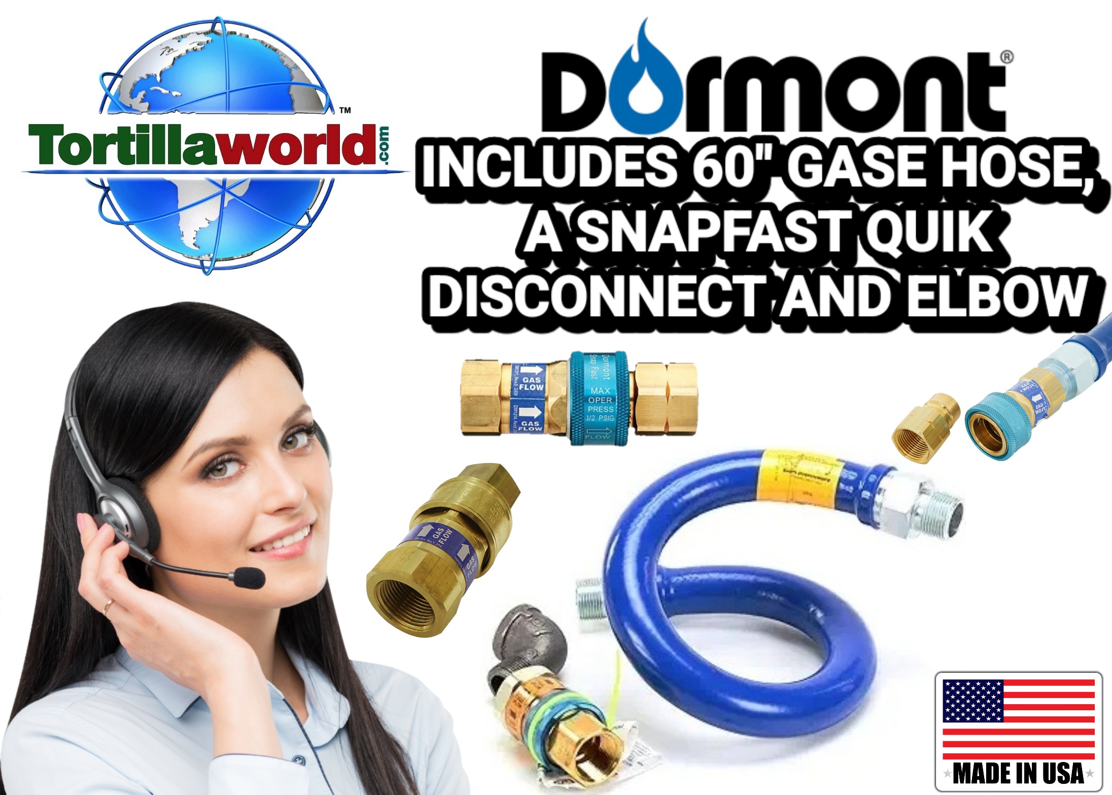 Commercial grade gas hose kit #16100BPQ60 contains (1) 1-60″ long commercial grade movable gas hose connector composed of 301 stainless steel corrugated tube covered with a tight weave of stainless-steel braid specifically engineered for caster mounted commercial cooking & tortilla Industry equipment like traditional corn cooking tubs, tortilla chips, tostadas and churrito basket fryers from 30 per hour etc. The outside hose coating is an antimicrobial PVC coating that inhibits growth of bacteria, mold and mildew on the connector. Rotational technology fittings on both ends of the connector rotate 360 degrees, greatly reducing stress at both connector ends. (2) 1-1″ Snapfast quik disconnect gas hose safety coupling is a durable push to connect & disconnect coupling that contains a thermal shutoff feature which is a polymer ring located inside the nipple that will melt and close the gas supply valve if the temperature rises above 350° F (177° C). The Snapfast quick disconnect couplings are designed to work only with the brand name of gas hose that we sell. It also features a push to connect feature which allows the coupling’s components to be joined quickly by simply pushing them together until they snap into place. The Snapfast disconnects the gas flow for safe, easy cleaning & maintenance and reconnects with just a push and a click. (3) 1-1″ elbow.