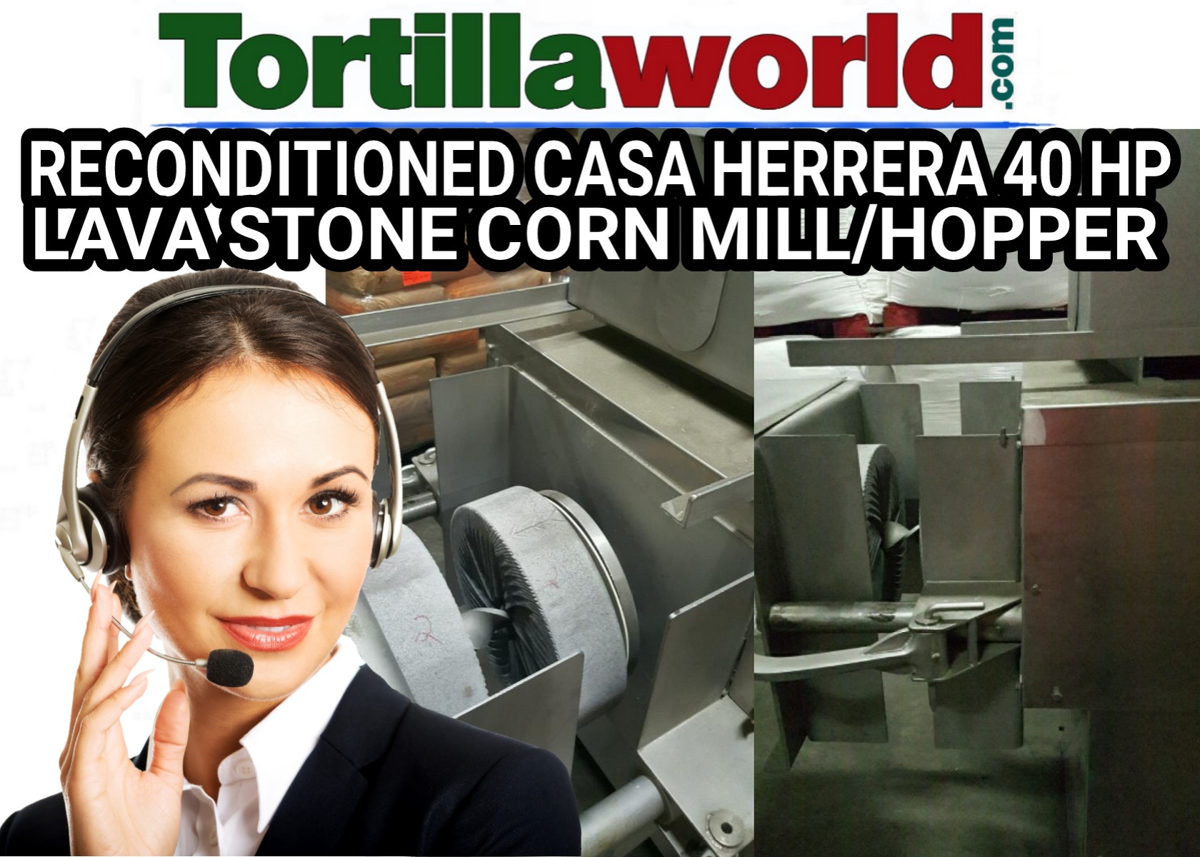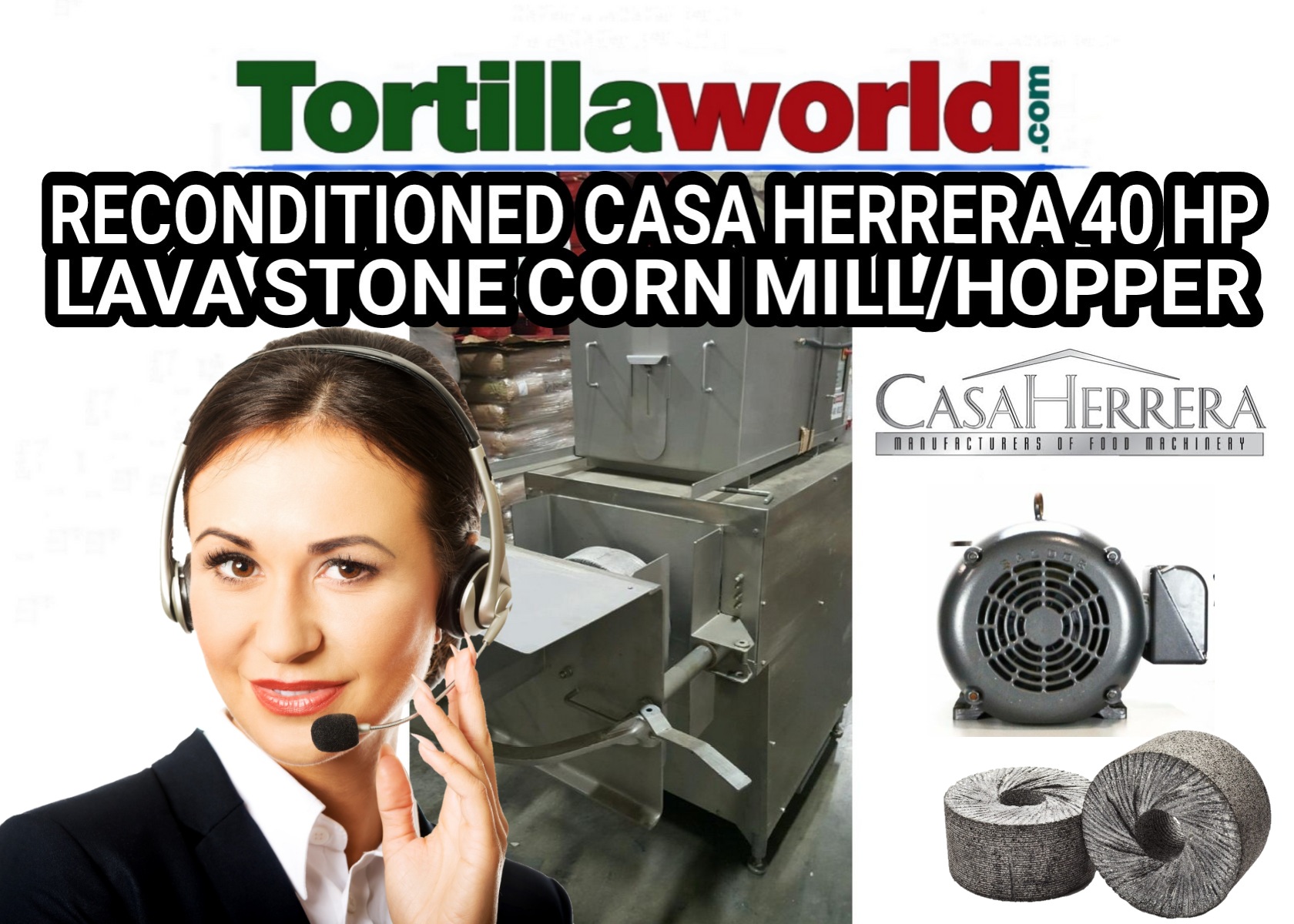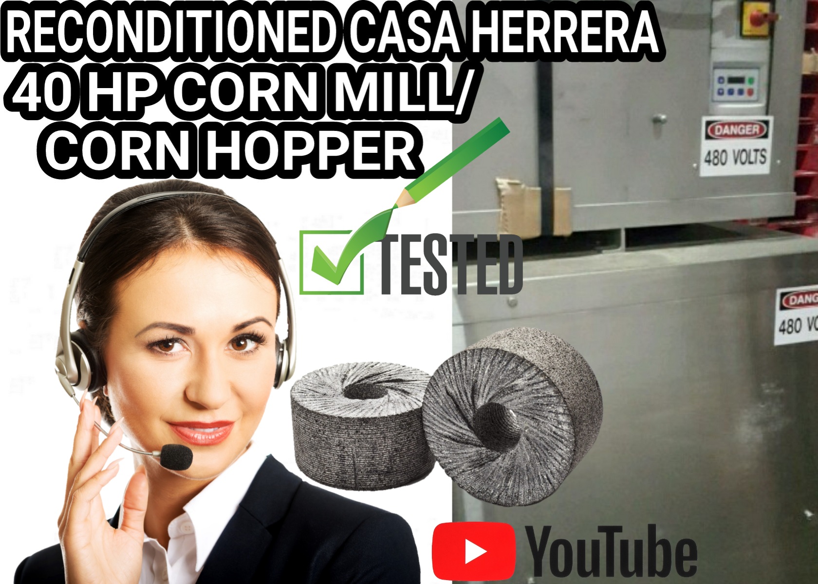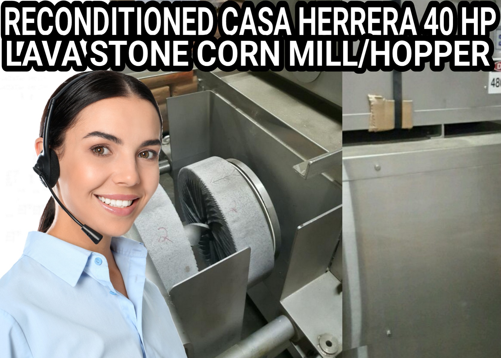 Reconditioned Casa Herrera 40 HP volcanic lava stone corn mill with corn hopper and 1 set of new 16″ lava stones. Note: magnetic starter for corn mill sold separately