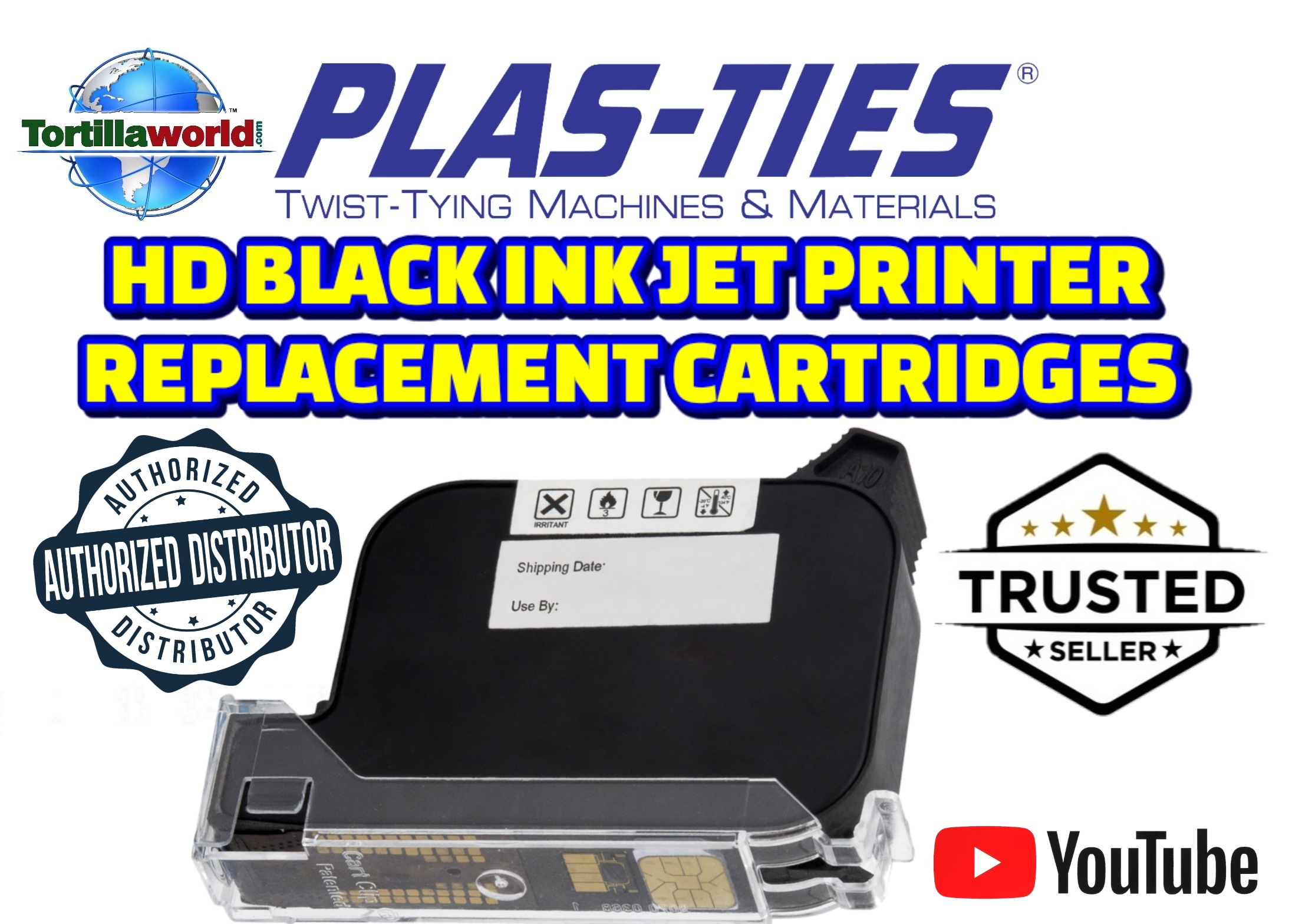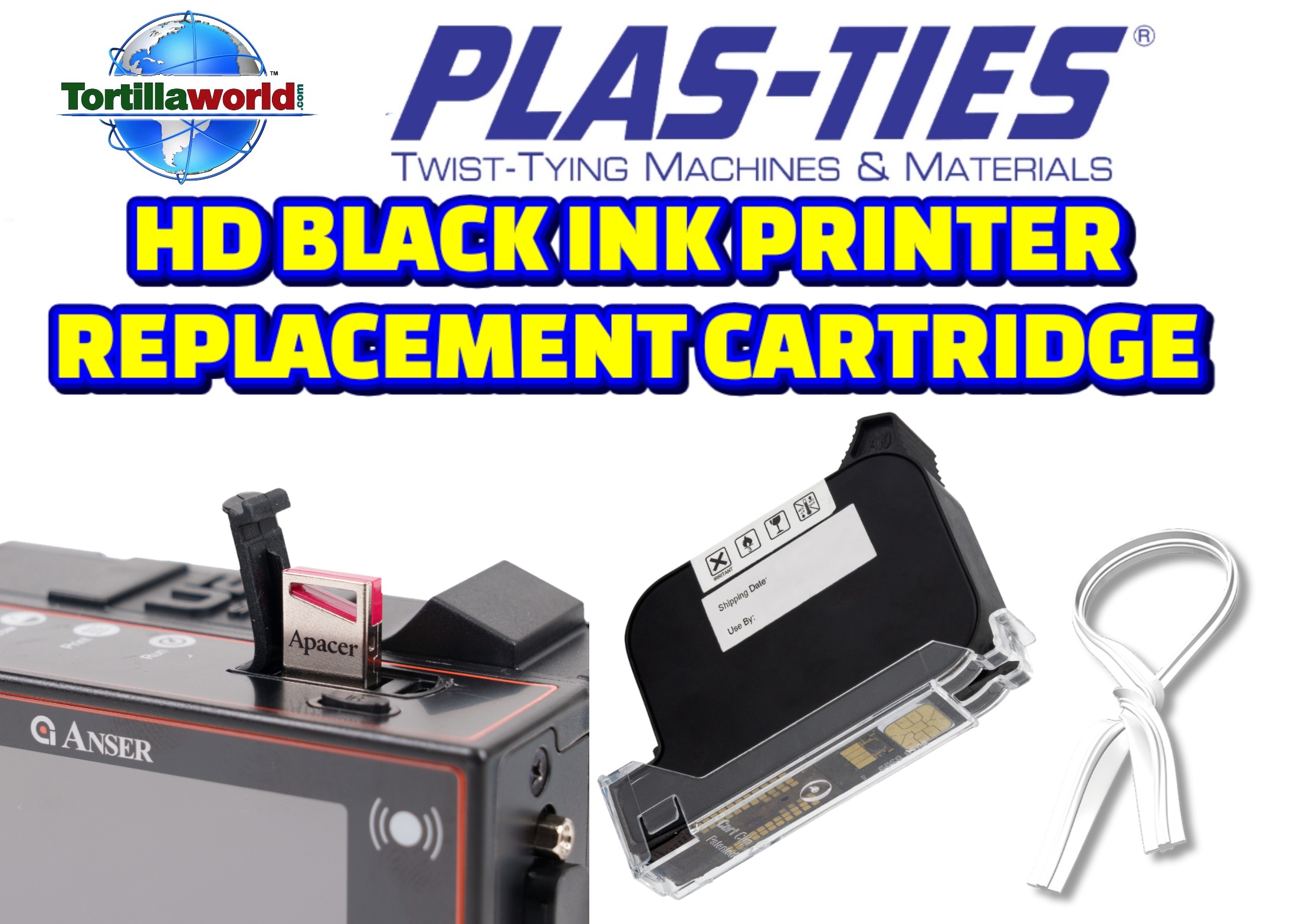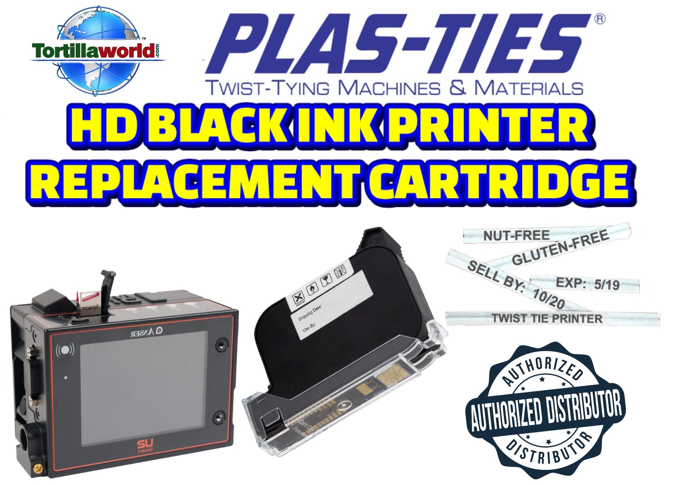 Tortillaworld is an authorized distributor of Plas-Ties who sells the complete line of HD-series twist-tying machines, materials, accessories & parts. You must use genuine Plas-Ties ink cartridges for optimal performance. If alternate cartridges are used, WARNING: “INVALID CARTRIDGE 8″ will appear on the screen