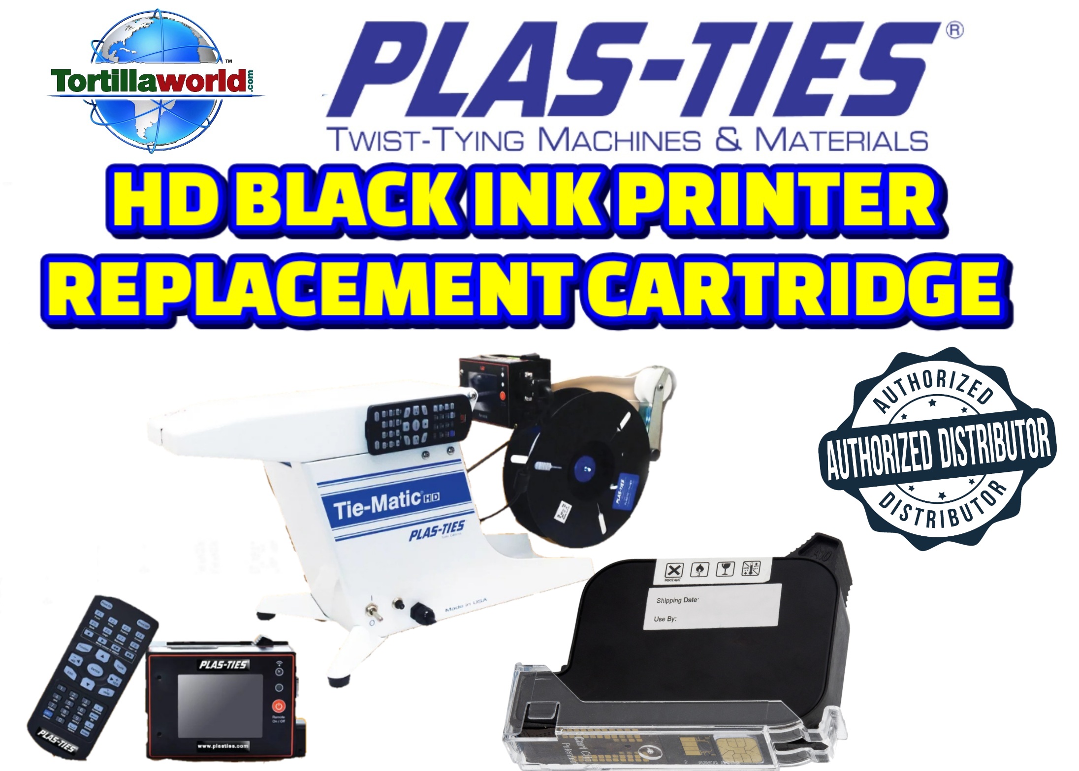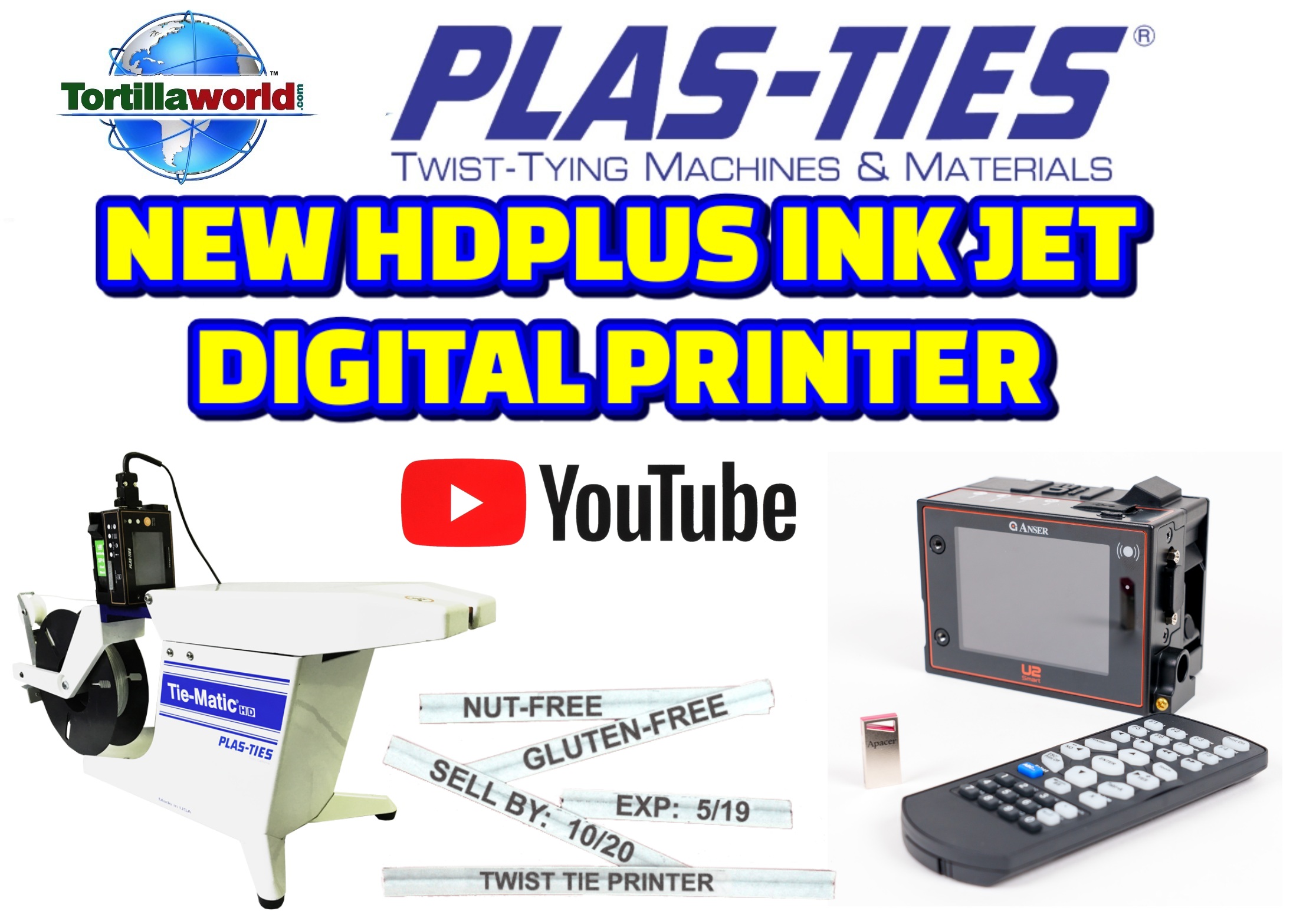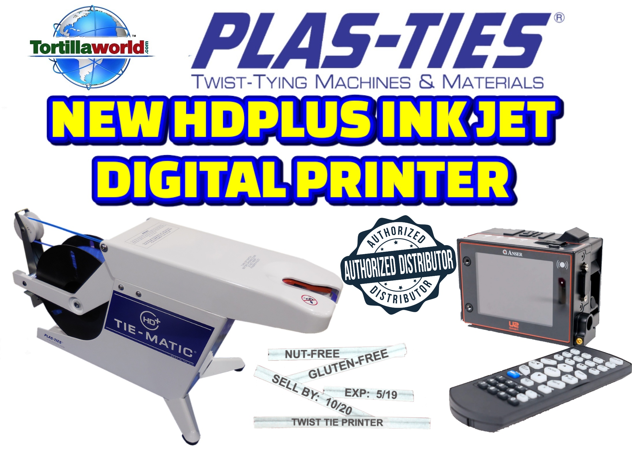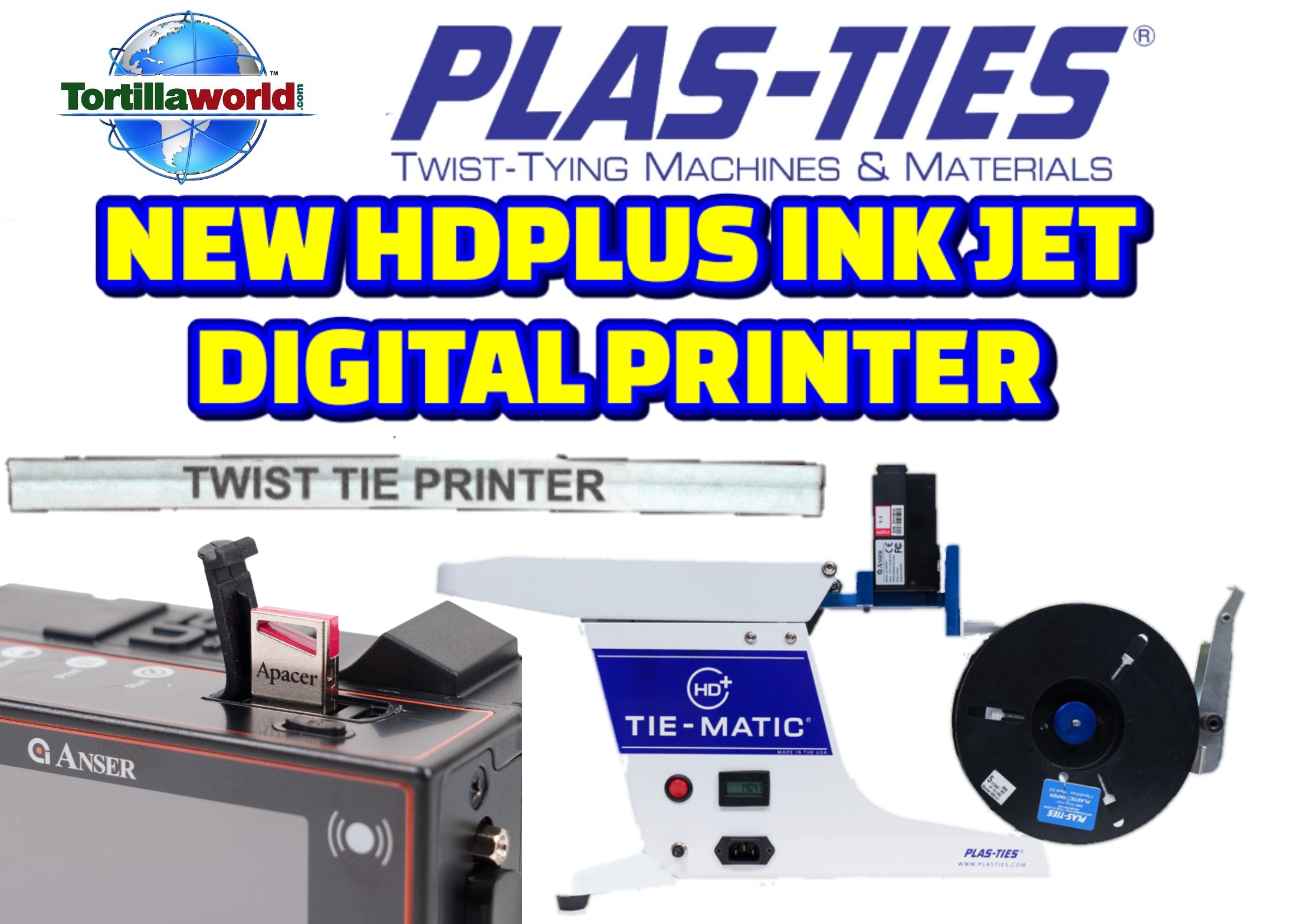Tortillaworld is an authorized distributor of Plas-Ties who sells the complete line of the HD series twist-tying machines, materials, accessories & parts. The ink Jet printer solution package includes printer, assembly, controller & 1 ink cartridge. It is a versatile twist tie printer with precise placement and a compact size. Easily installed onto the Tie-Matic HD-series twist-tie machines. This complete package will allow you to close your bag & label your product in just 1 second. The Tie-Matic quickly twist ties your product & the Inkjet printer prints on the tie