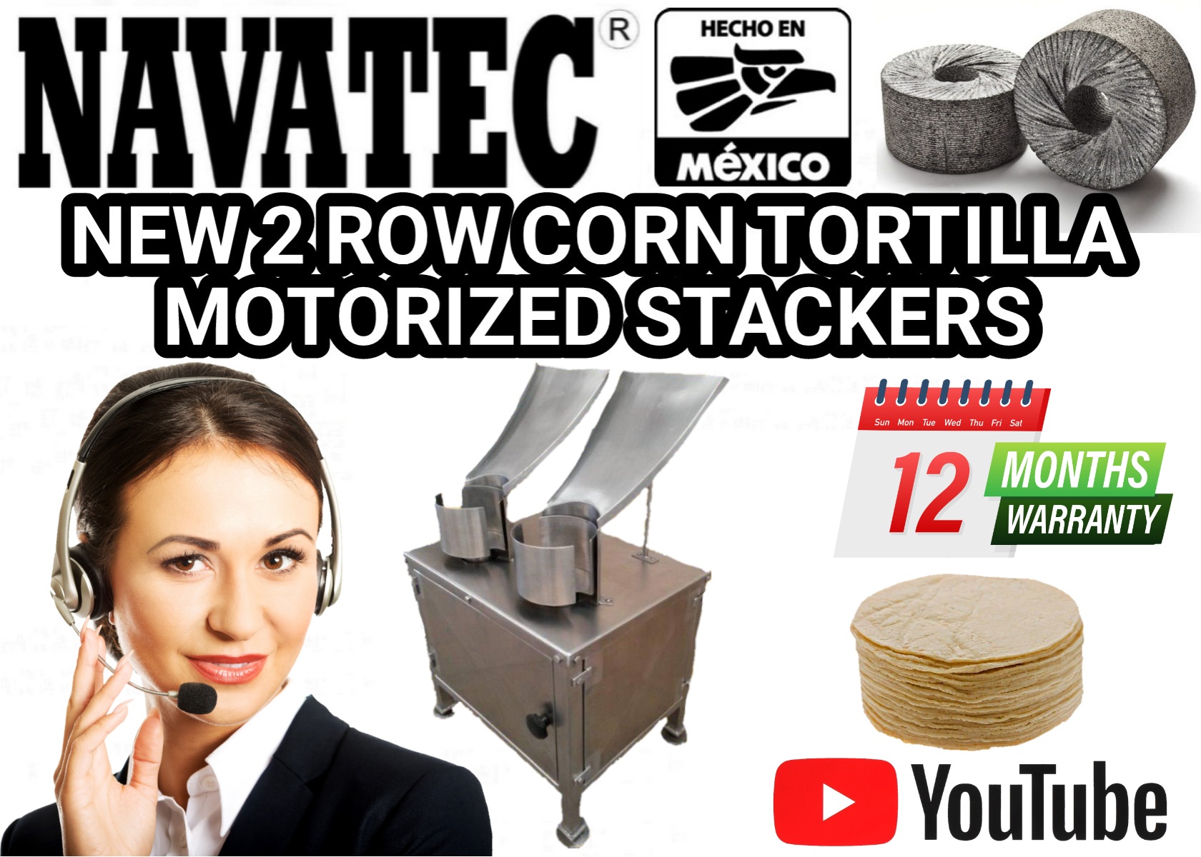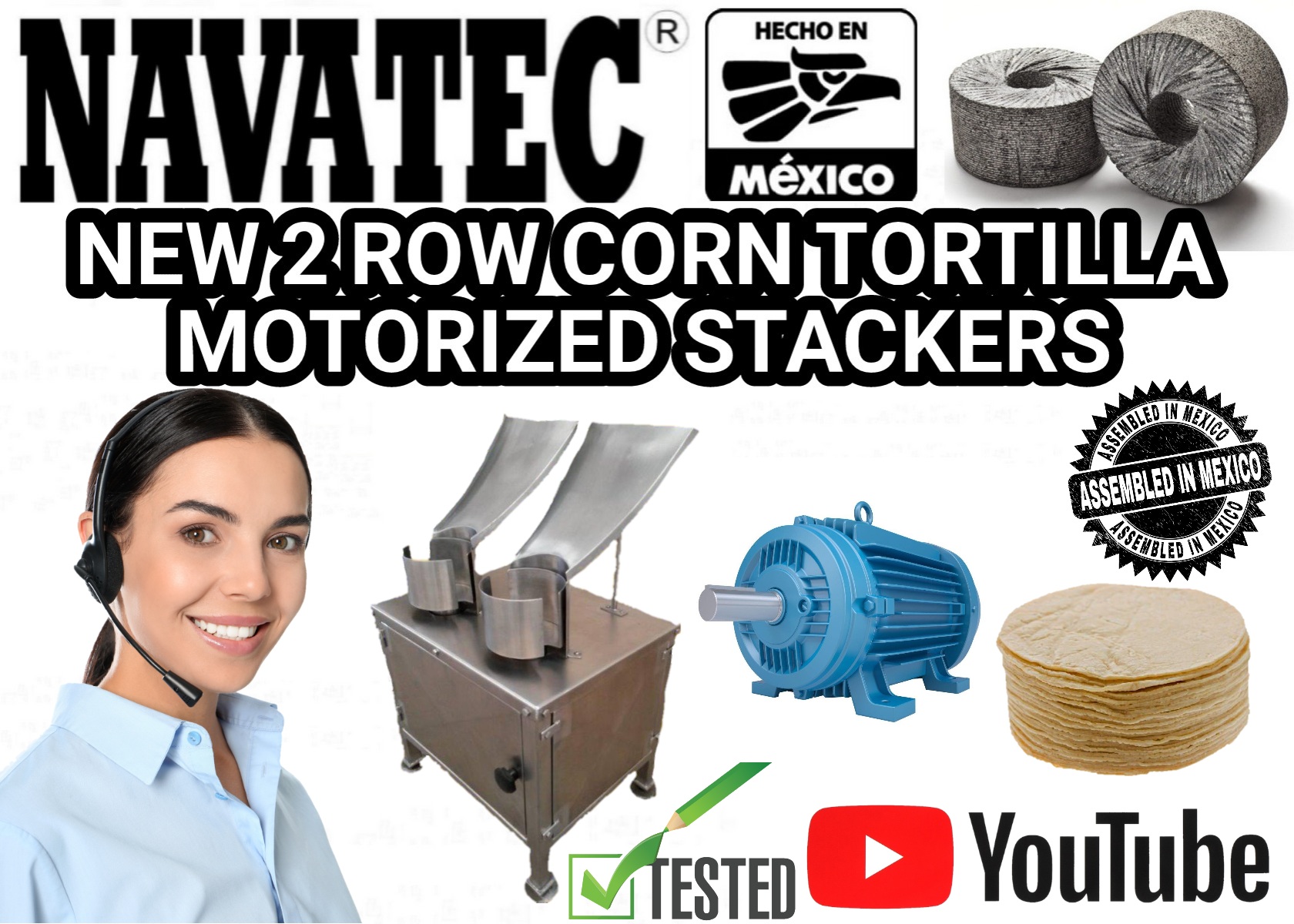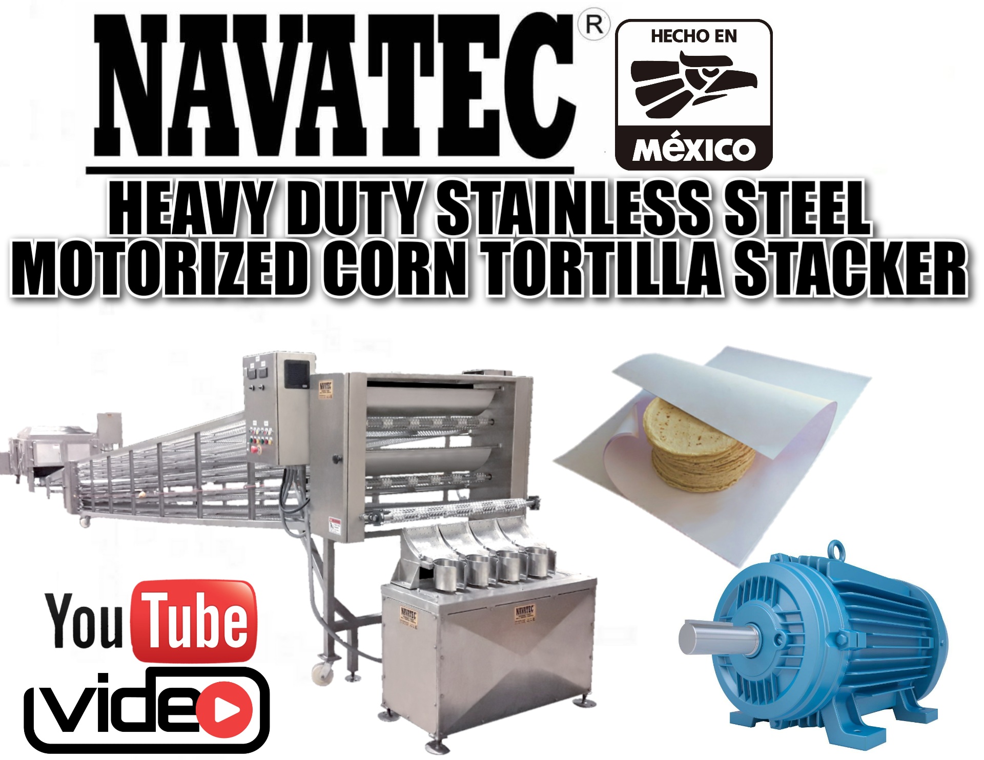 Navatec heavy duty motorized corn tortilla 2 row stacker has removable inserts made for different size tortilla out of 304 stainless steel.