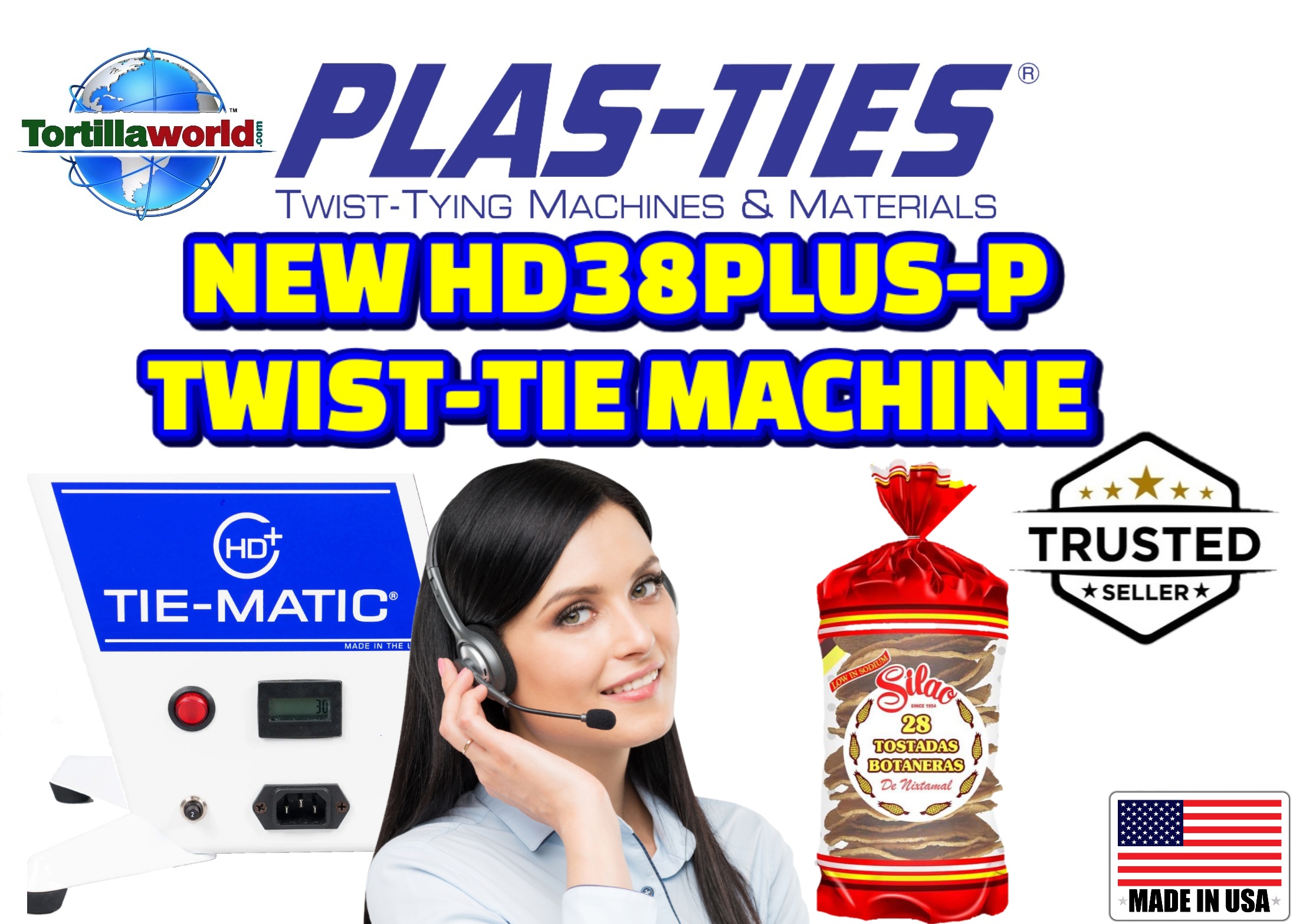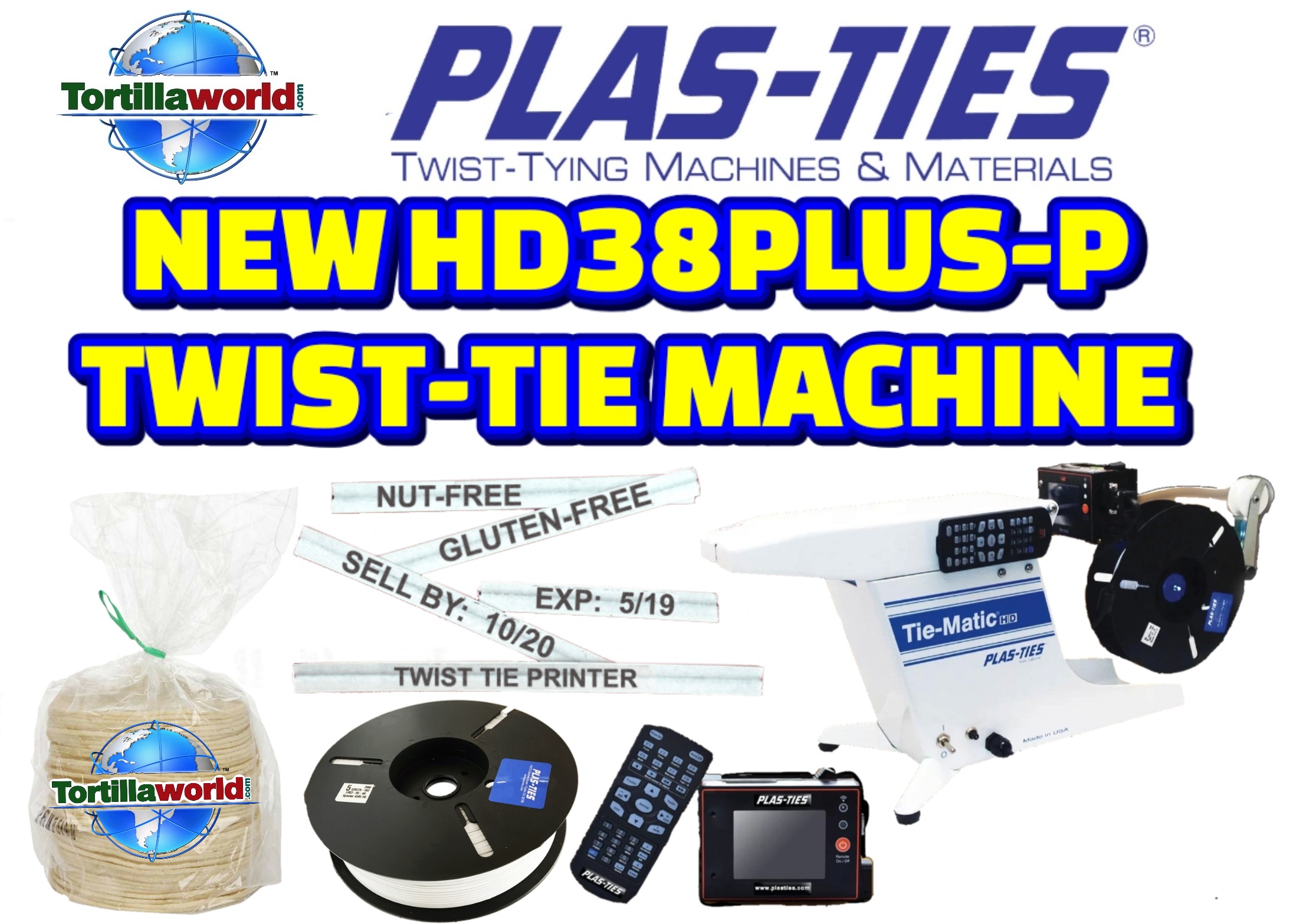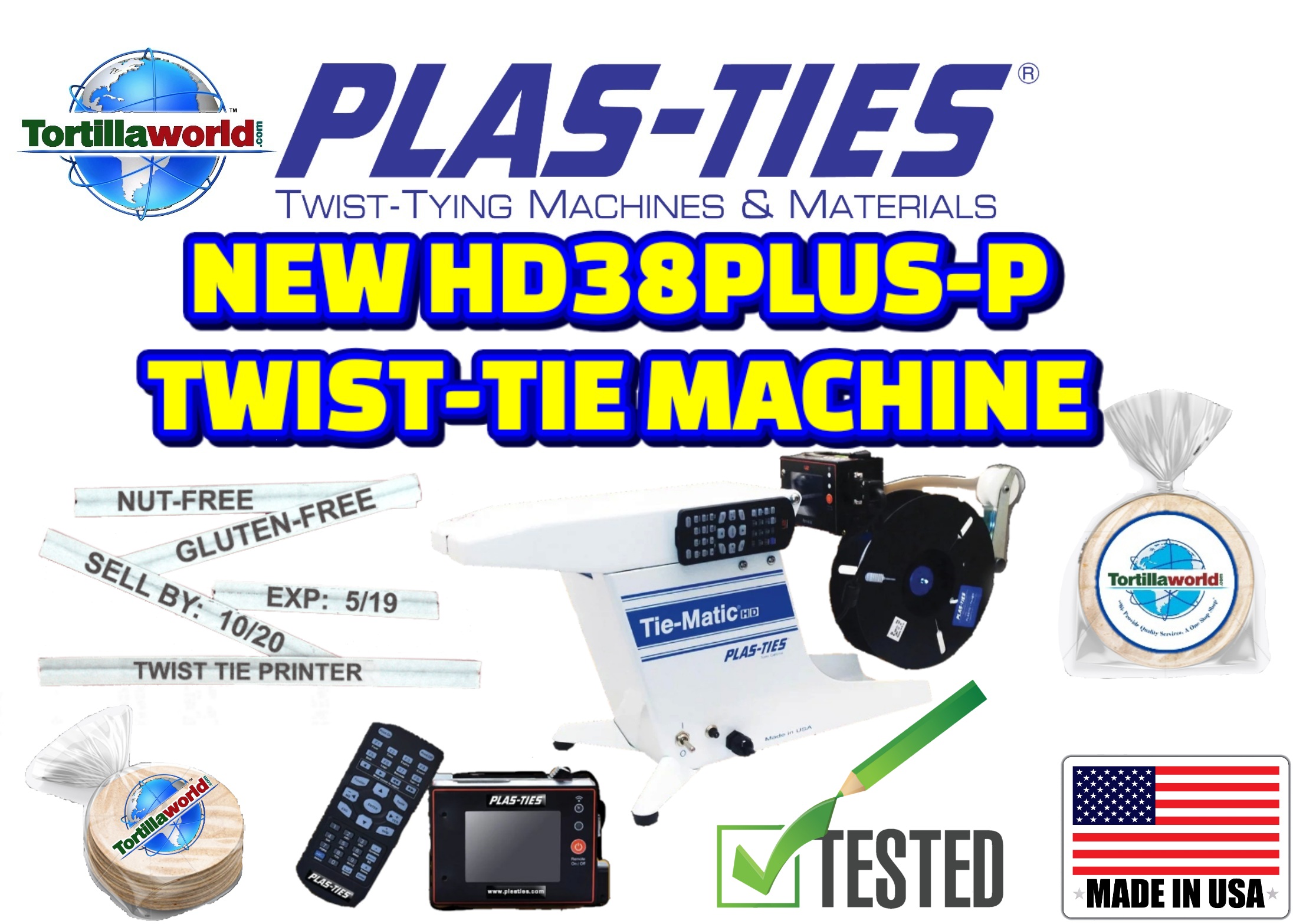 Tortillaworld is an authorized distributor of Plas-Ties who sells the complete line of HD-series Plas-ties twist-tying machines, materials, accessories & parts. The HD38PLUS-P Tie-Matic has been proven to work in the tortilla Industry for over 30 years. Close your bag and label your product in just one second. The new digital printer software allows you to to program the printed message instead of manually changing out the printed letters. The Tie-Matic HD38PLUS-P twist-tie machine. Its fast, durable & reliable