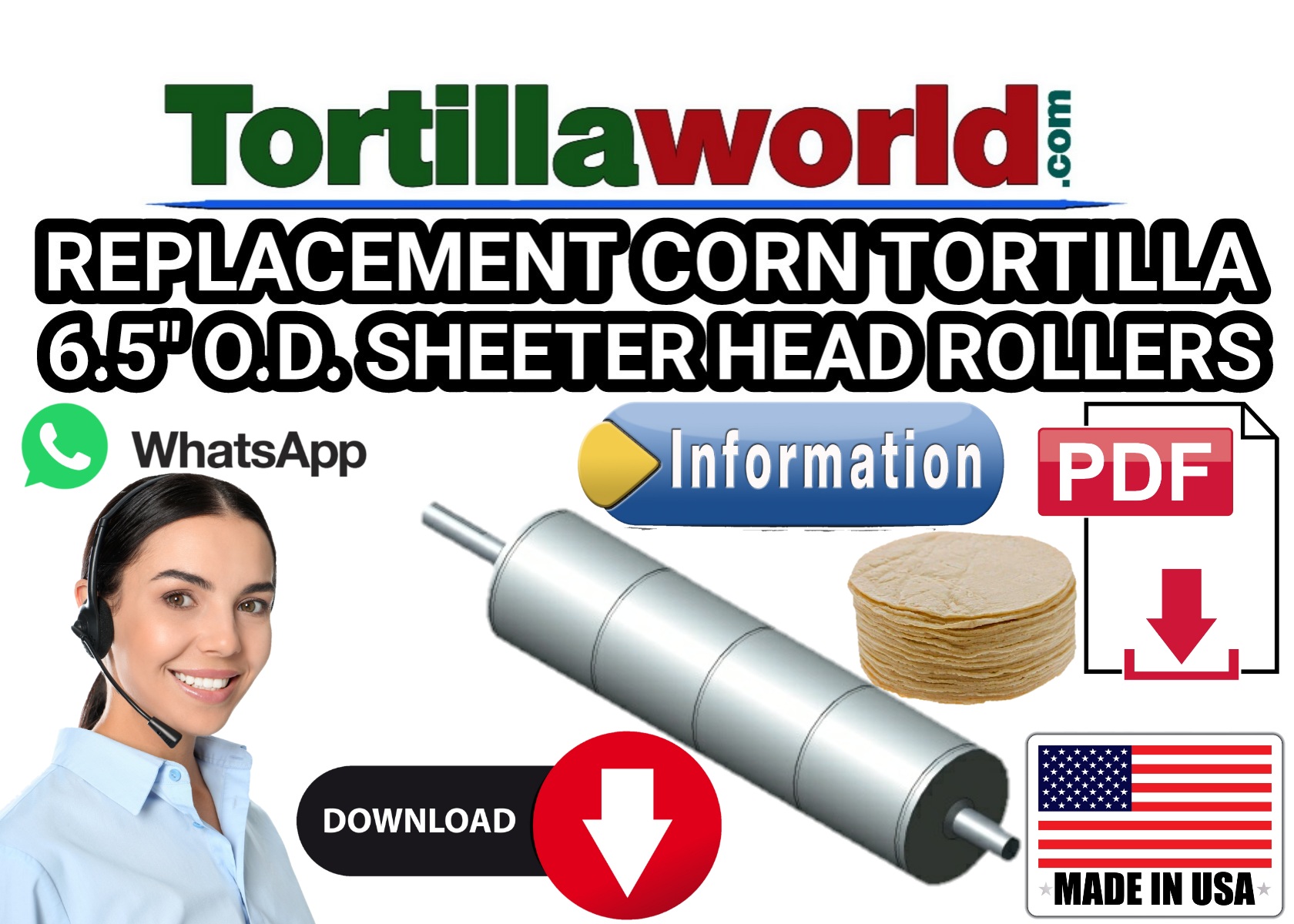 Tortillaworld makes ordering your new corn tortilla sheeter head rollers convenient with our easy order form you can print out by clicking the tab above. Send back completed form by email to parts@tortillaworld.com. Note: We can refurbish all rollers leaving them looking like new again saving you the expense of buying new