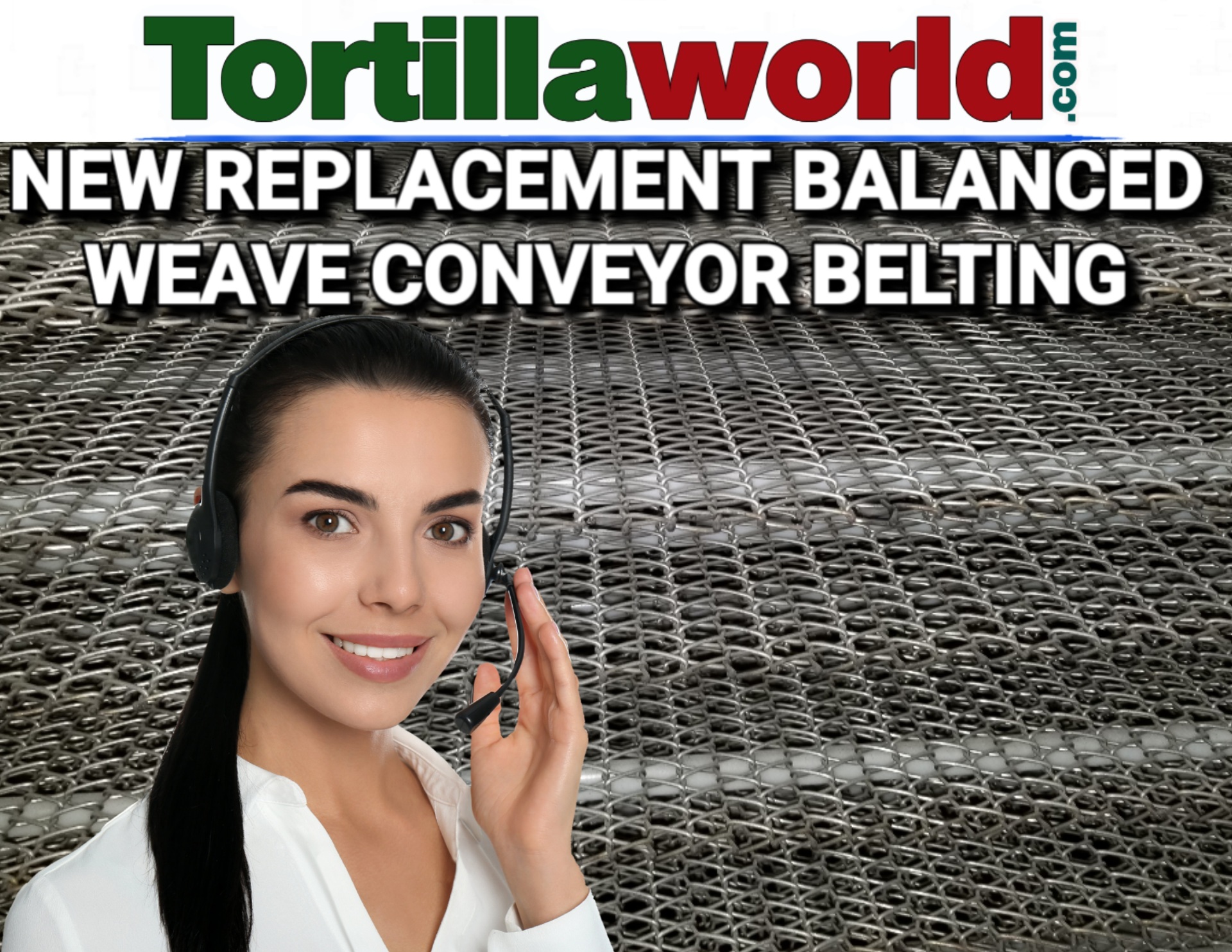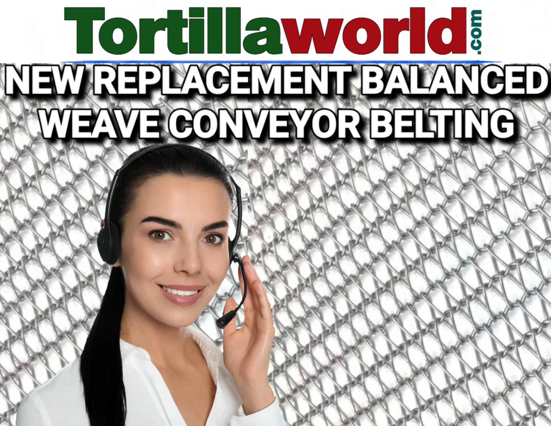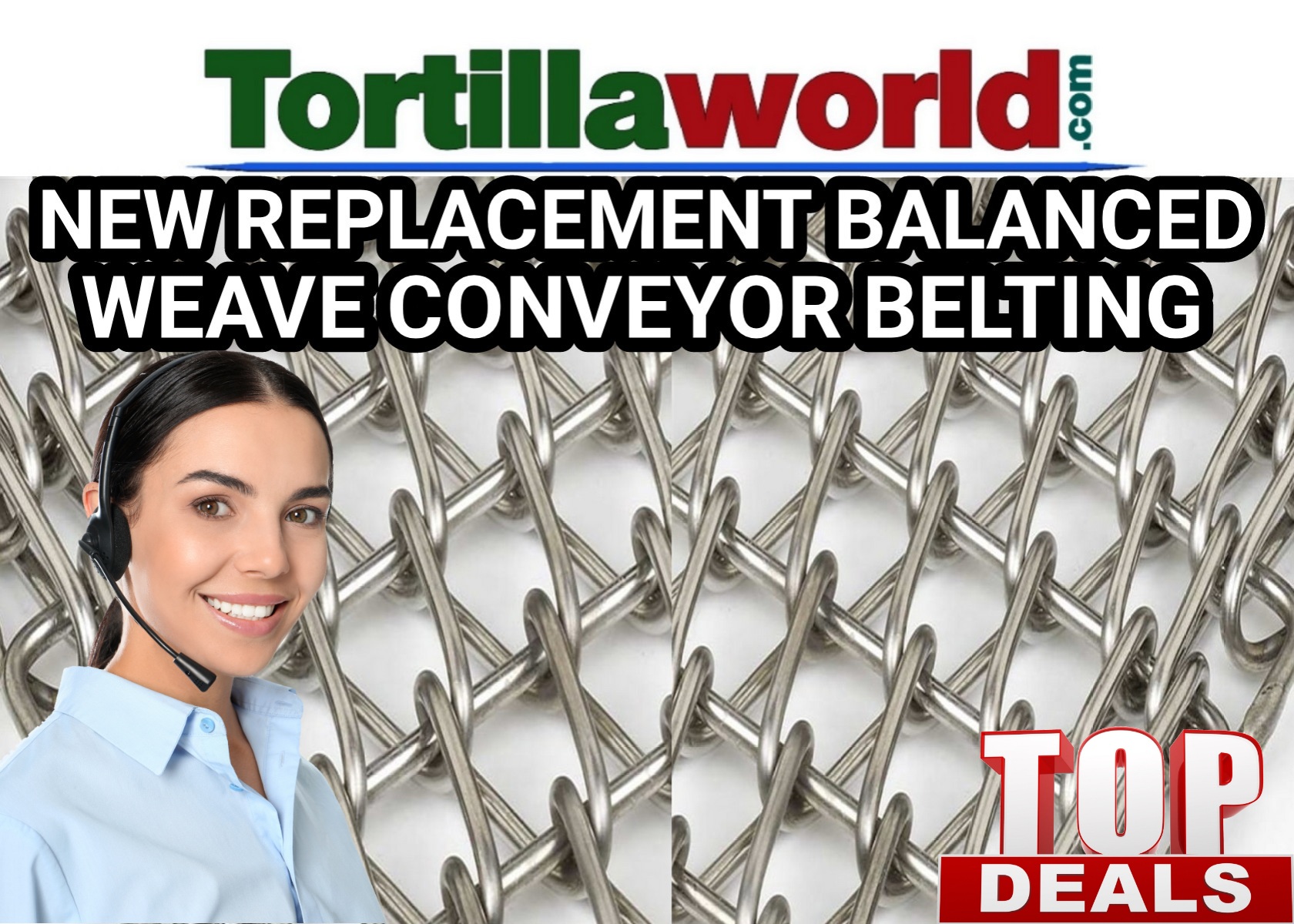 Replacement stainless steel balance weave style belting for corn & flour tortilla cooling conveyors sold by the foot in all sizes for corn & flour tortilla cooling conveyors. Total length in feet & inches? width of belting? brand of conveyor? how many tiers does the conveyor have? year conveyor was made? which tier are you replacing, 1st, 2nd or 3rd etc? send pictures of belting. Send us your contact information & information below where it says submit a comment
