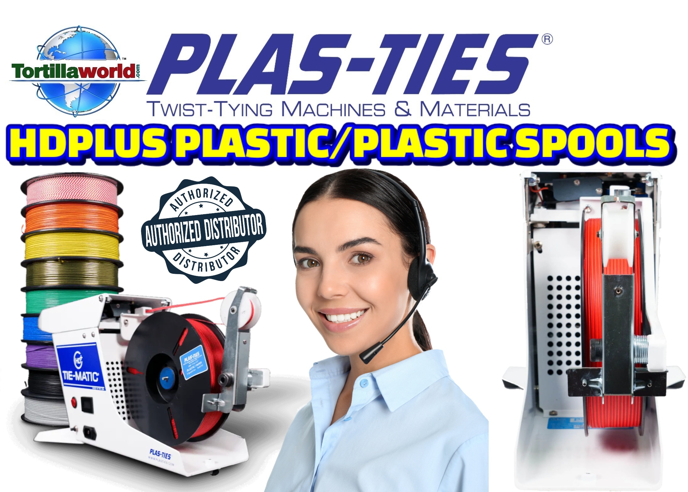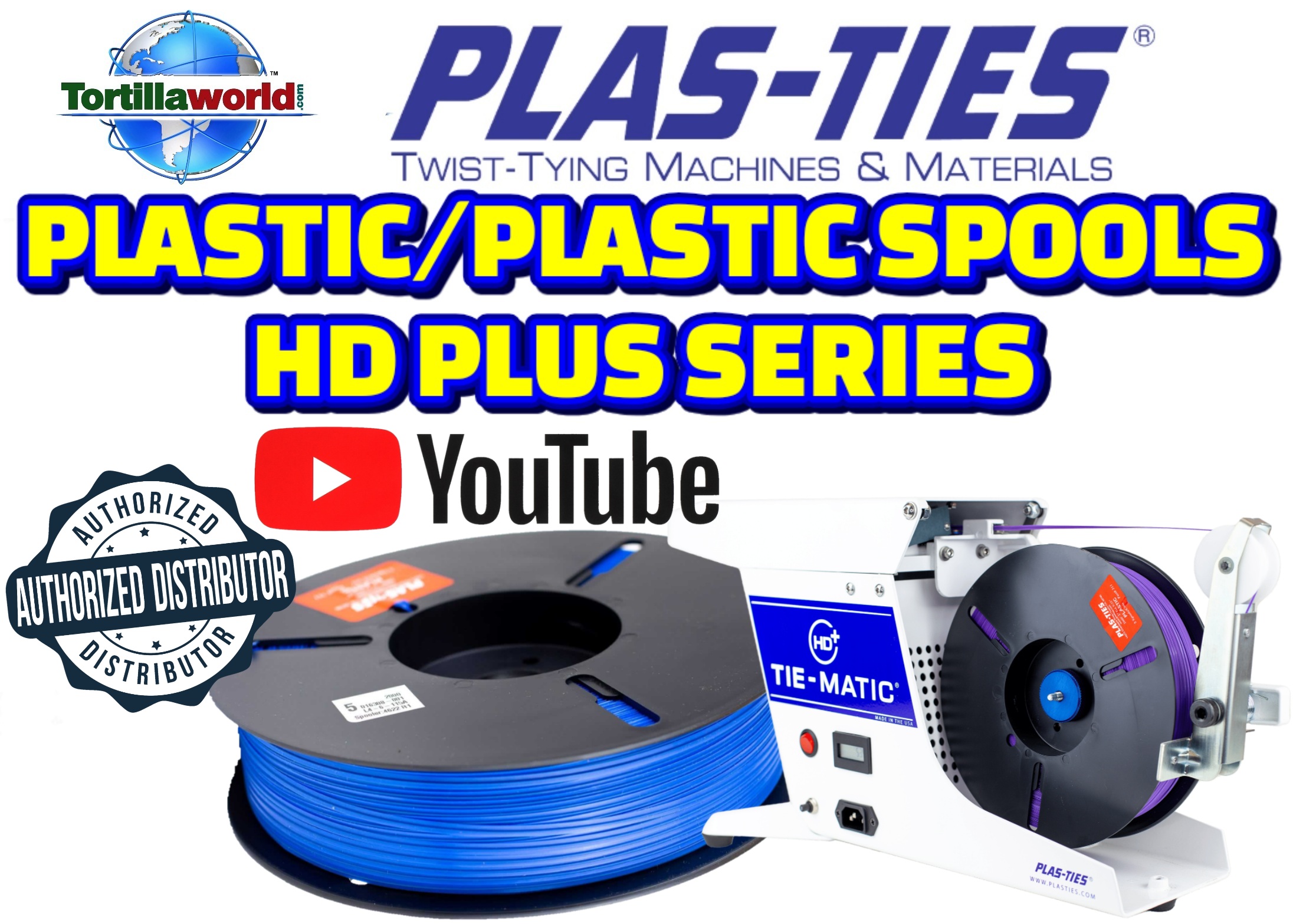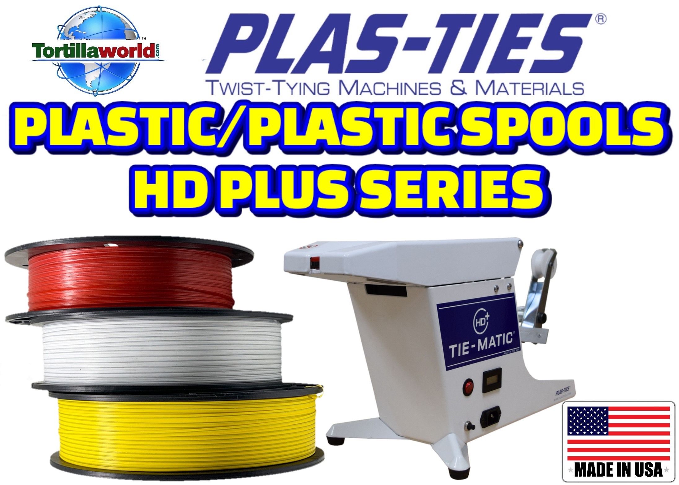 Tortillaworld is an authorized distributor of Plas-Ties who sells the complete line of HD-series twist-tying machines, materials, accessories & parts. Genuine Plas-Ties twist-tie material provides maximum performance from your Tie-Matic HD-series twist-tying machines. The durable, flexible, and reusable plastic material provides superior temporary fastening solutions for all your applications. The #311 spools are designed with a metal core encased in plastic to resist rust. The flexible core and plastic sheath wrap around an object to be bundled. From the food industry to the Industrial marketplace, our spools provide the ideal closure for your products. Choose from a multitude of colors including: Red, White, Blue, Green, Yellow, Orange, Black, Brown, Tan, Grey, Pink, Violet & Clear. The #311 spool is ideal for usage on the Tie-Matic HD-series machines. Depending on the machine used, the 2000 foot spool length supplies 4,800-6,400 ties per spool
