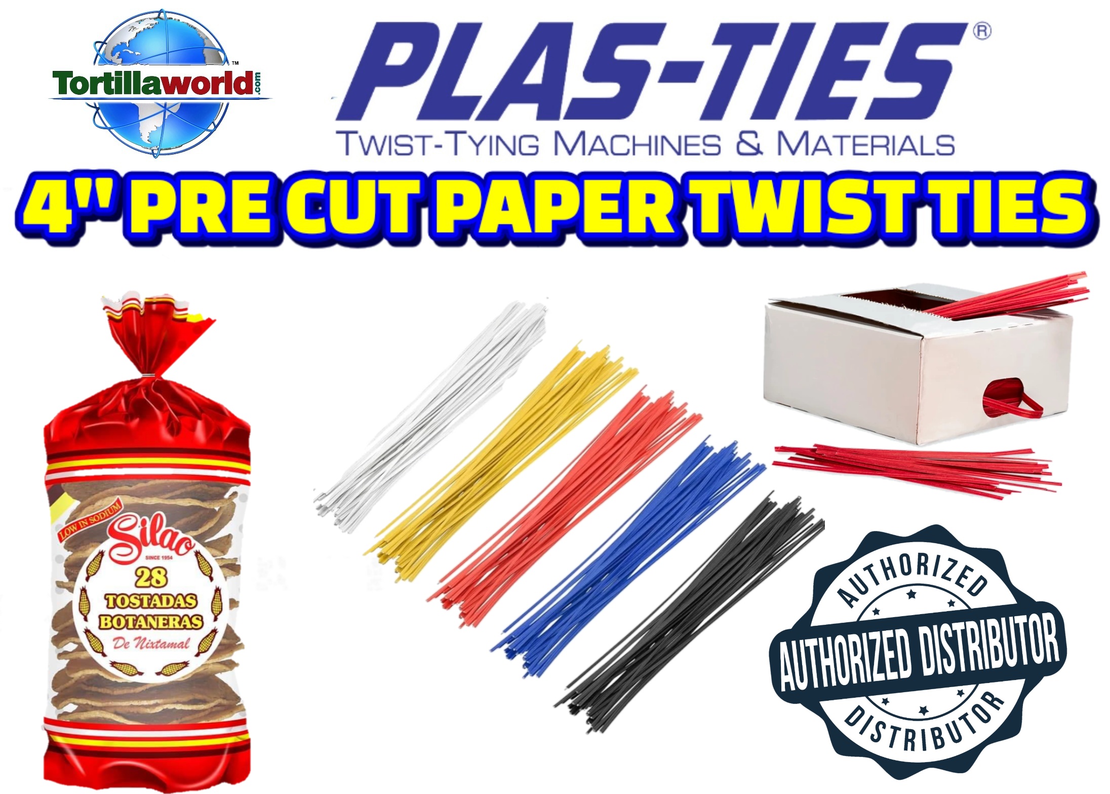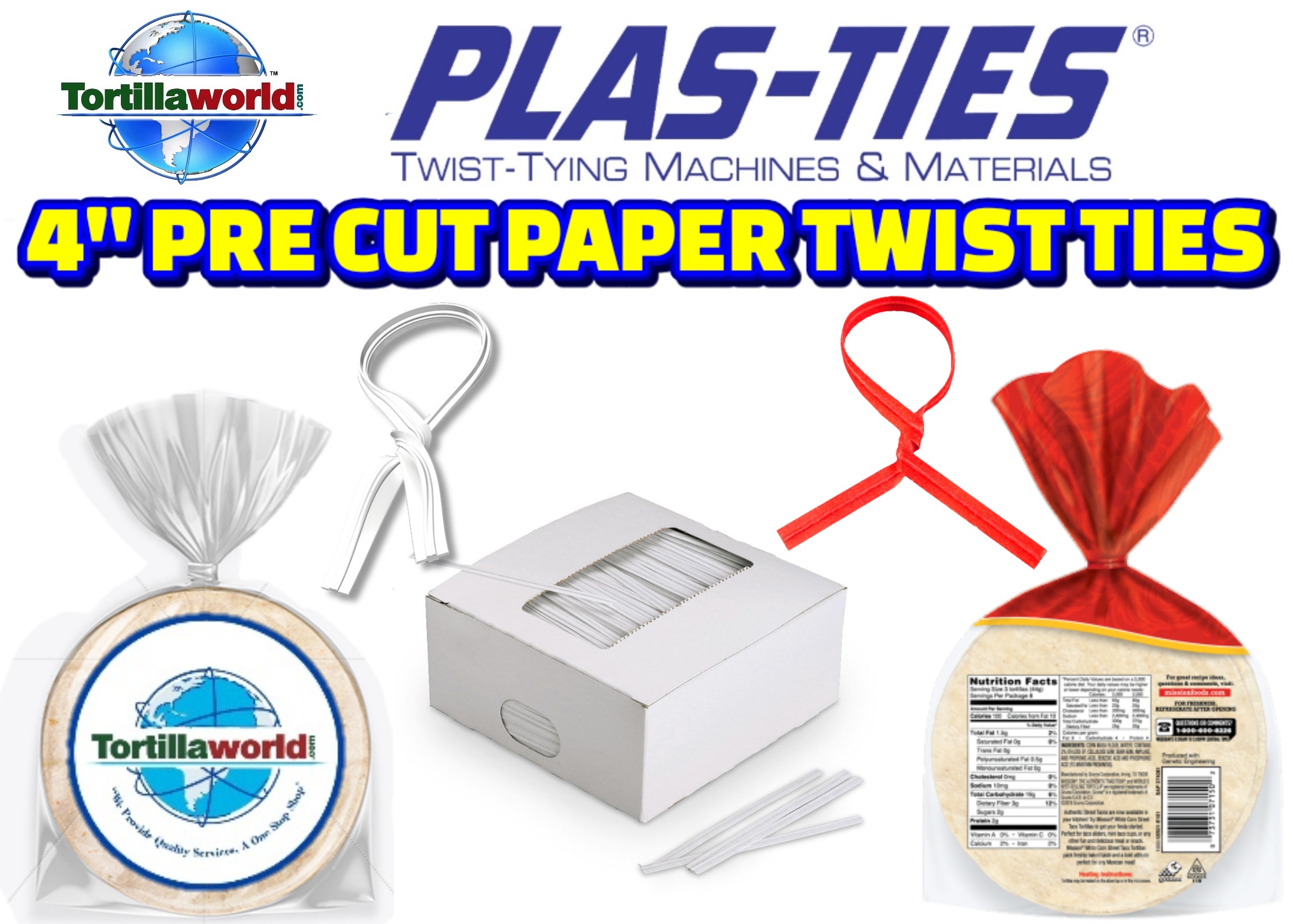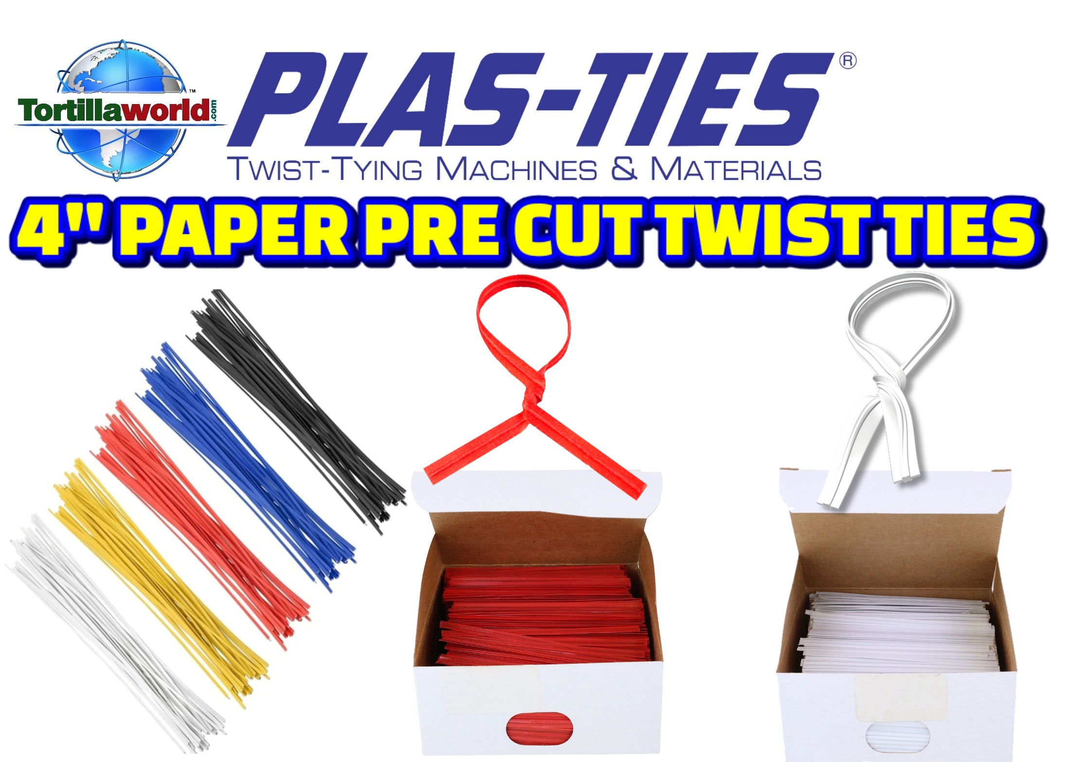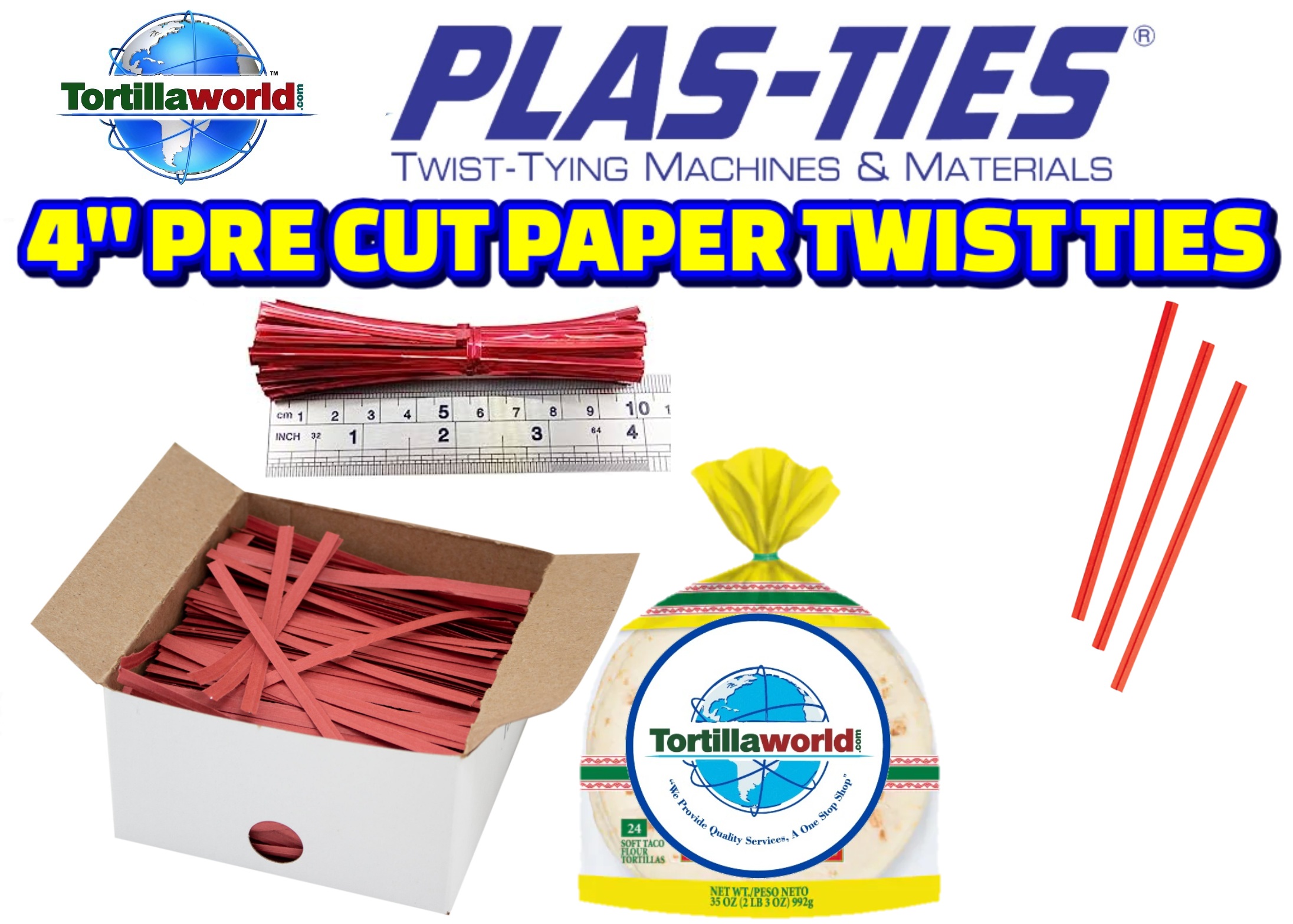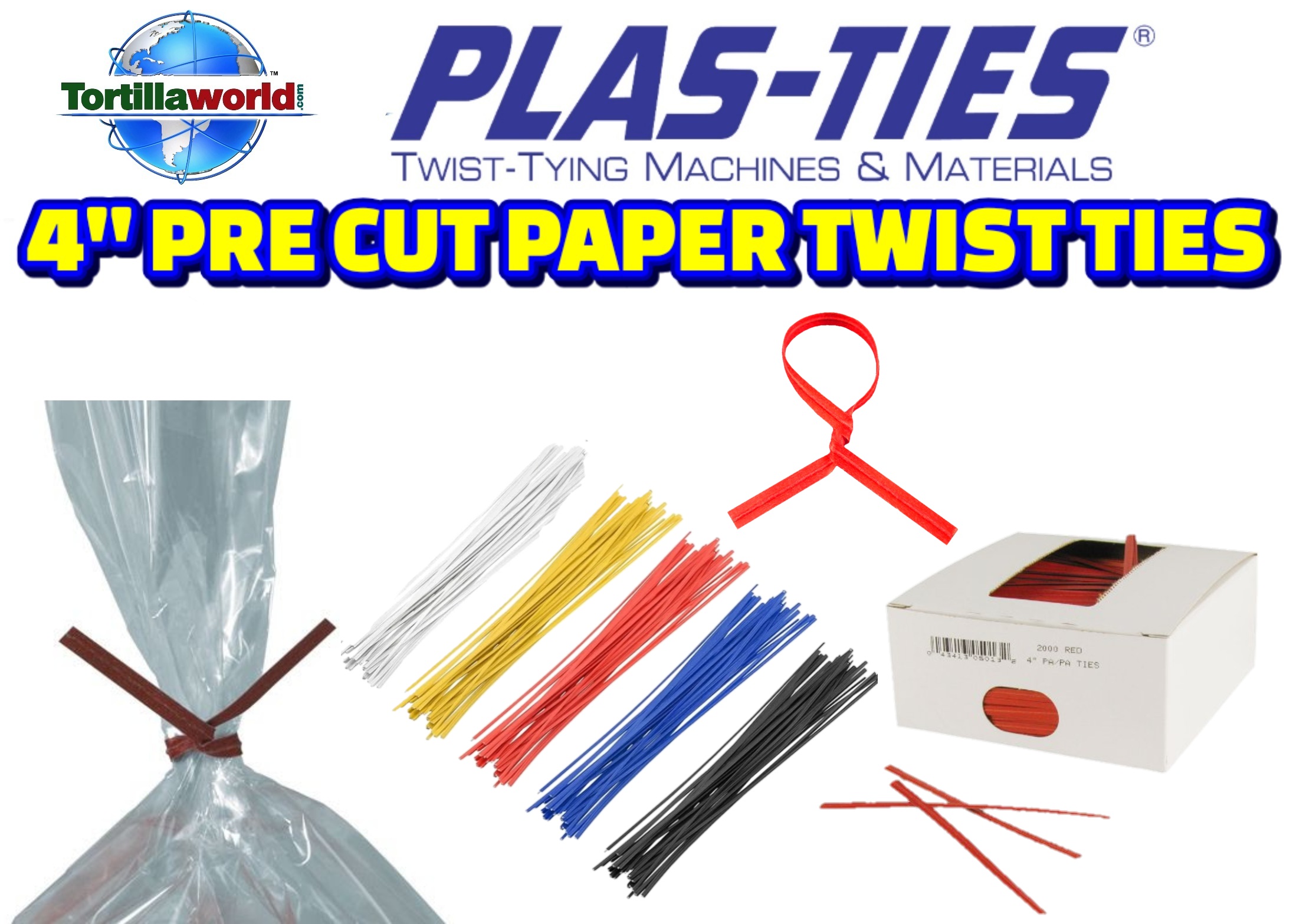 Tortillaworld has standard red & white 4″ twist-ties in-stock for immediate shipping for hand tying your corn & flour tortilla bags. No machine required. Tortillaworld sells these pre-cut 4″ twist-ties by the case which contains 25 boxes with 2,000 twist-ties per box. 50,000.00 twist-ties per case. Special order 4″ plastic & paper colors available, Blue, Green, Yellow, Orange, Black, Brown, Violet, Tan & Pink require a minimum order of 8 cases