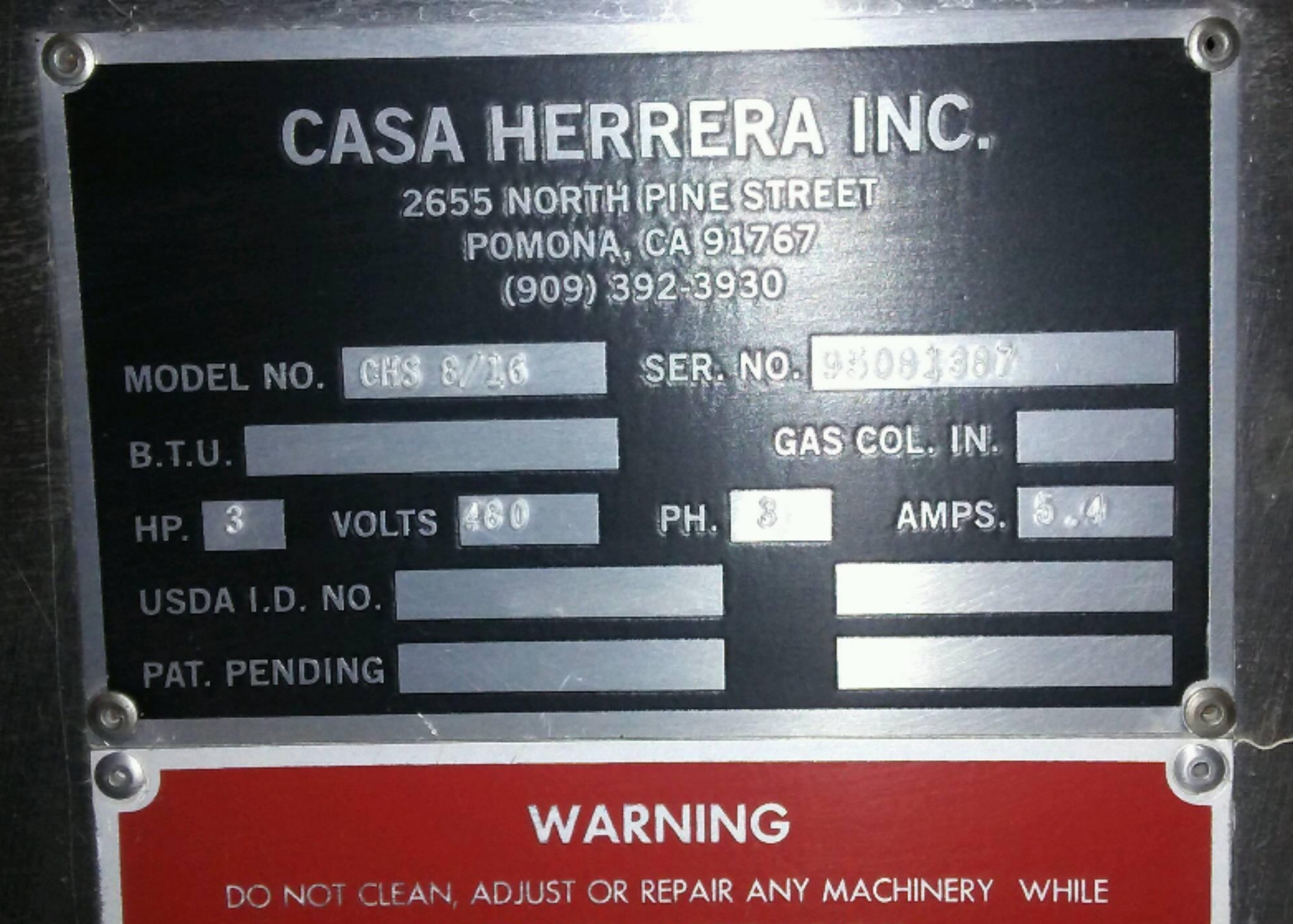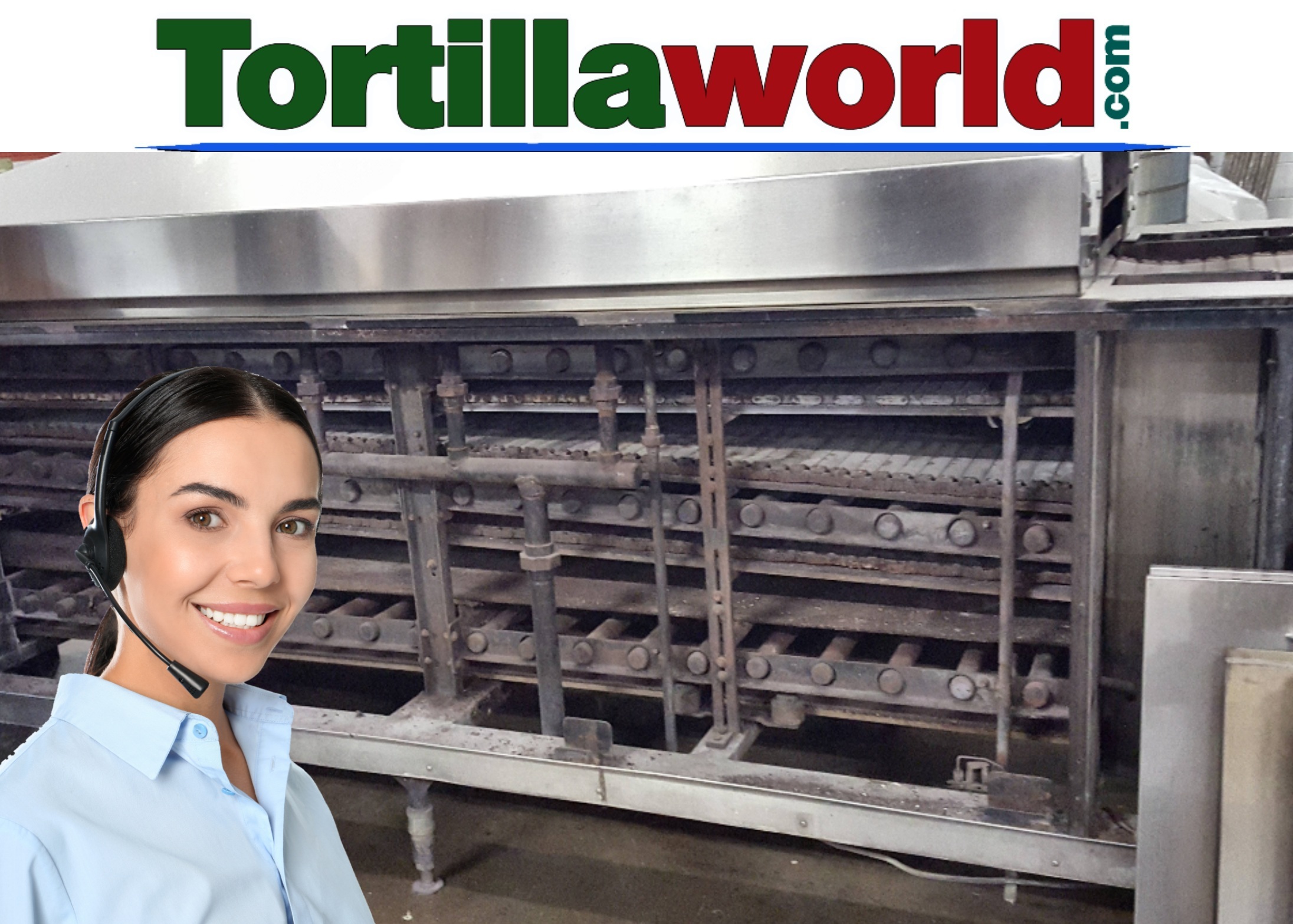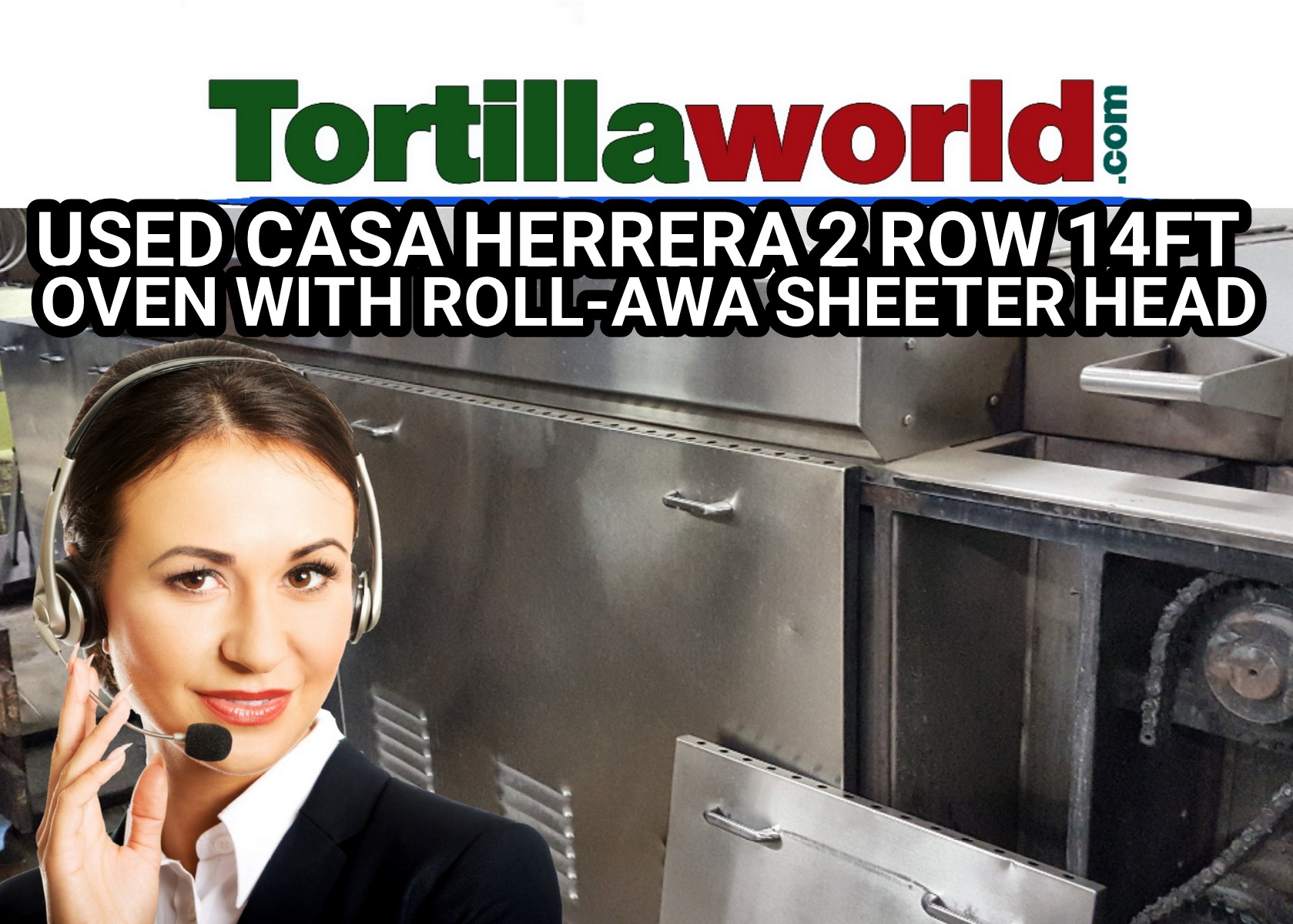 Used Casa Herrera 2 row corn tortilla 14 ft. oven with a 8.5″ O.D. roll-away sheeter head, slat, slat & CB-5 on the bottom. Great condition, about 5,000 hrs. of use