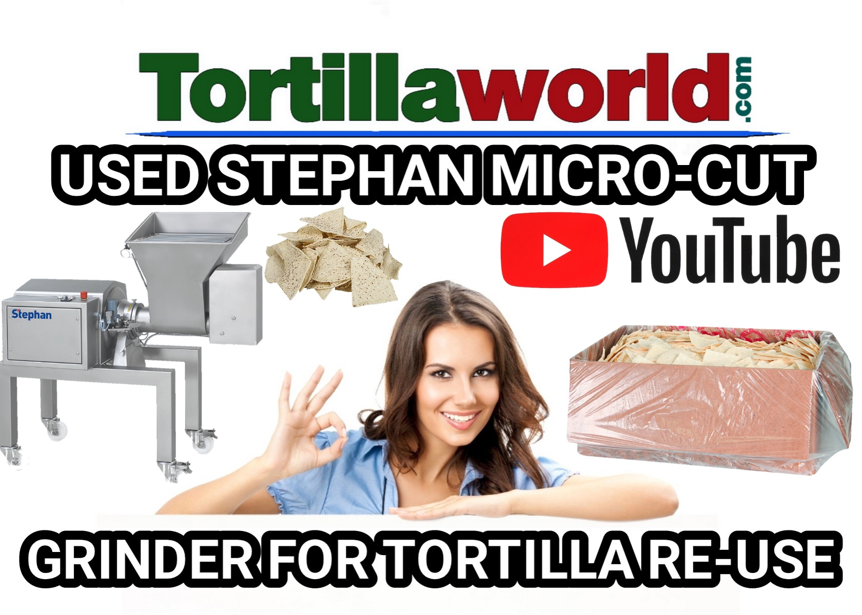 Used Stephan micro-cut tortilla grinder used to re-use good tortillas back in your mixer with fresh masa dough & make the tortillas over again saving you money instead of throwing away good tortillas that did not come out completely round or some other defect. There are 2 steps to get a smooth and fine product. Put the defective tortillas directly into the grinders hopper and select the feeding speed then press the start. That’s all
